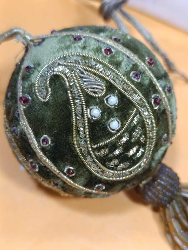 P101----SERAMİK VE TAŞLI KUMAŞ KAPLAMA TAVAN SÜSÜ TOP başlıklı antika/koleksiyon objesinin menşei belirtilmemiştir. Objenin ait olduğu dönem bilinmeketedir.
