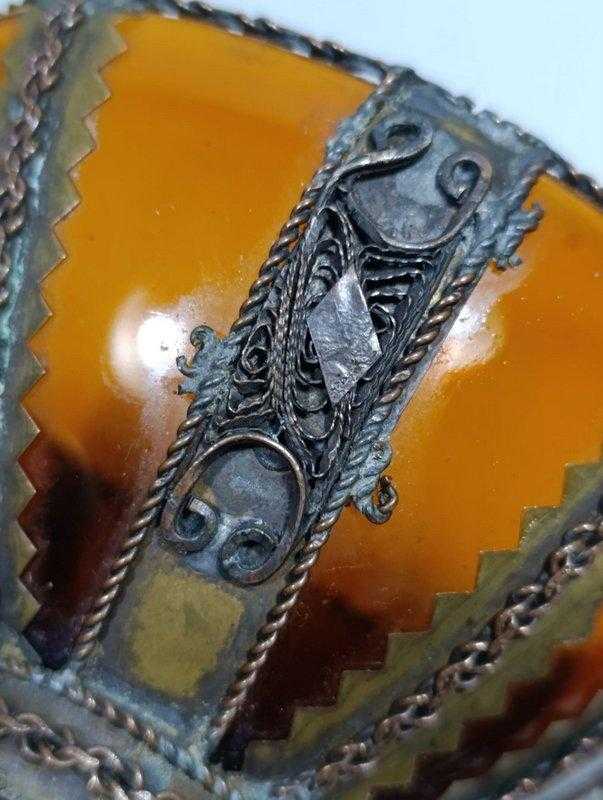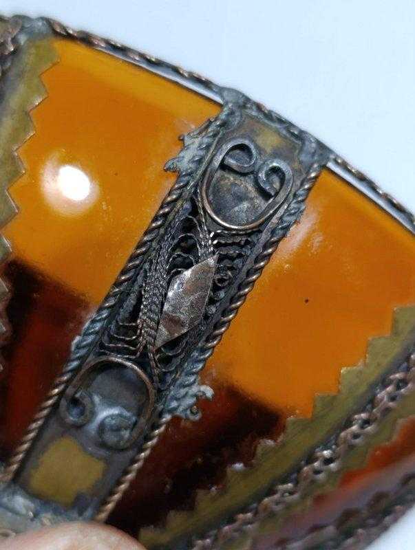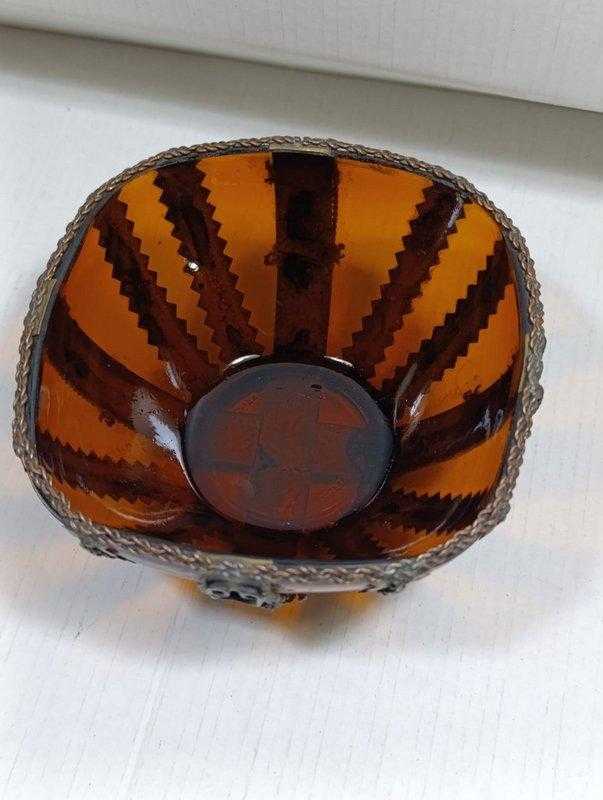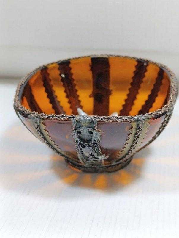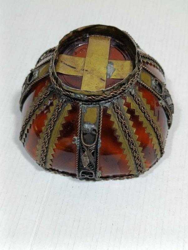 P38----BAKIR DEKORLU ESKİ CAM KASE başlıklı antika/koleksiyon objesinin menşei belirtilmemiştir. Objenin ait olduğu dönem bilinmeketedir.