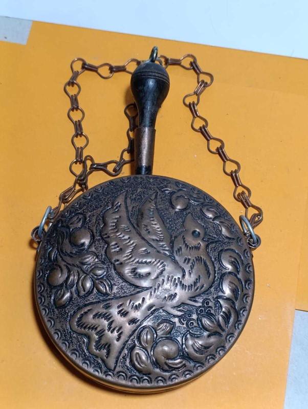 P56---KABARTMA KUŞ DESENLİ BAKIR MATARA başlıklı antika/koleksiyon objesinin menşei belirtilmemiştir. Objenin ait olduğu dönem bilinmeketedir.