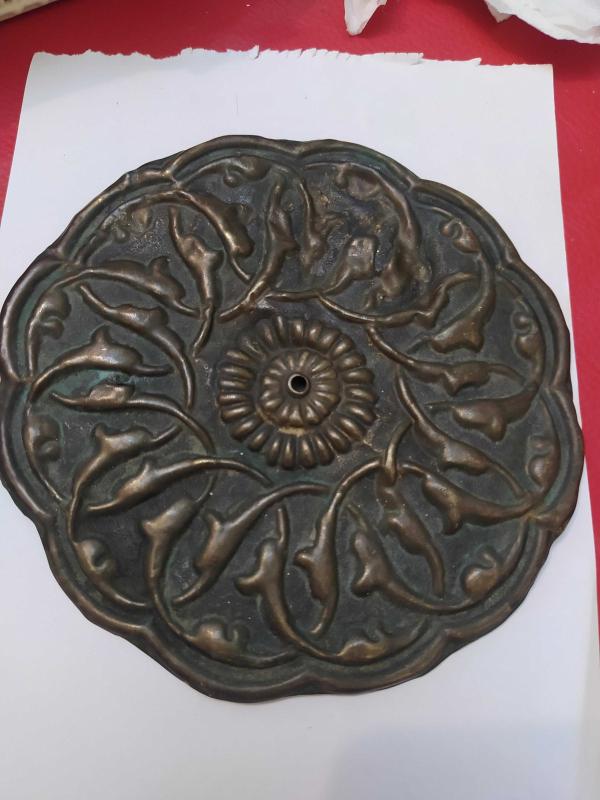 P83---ANTİKA PİRİNÇ TAVAN GÖBEĞİ başlıklı antika/koleksiyon objesi Türkiye menşe’lidir. 1950-1999 arası dönemine aittir.