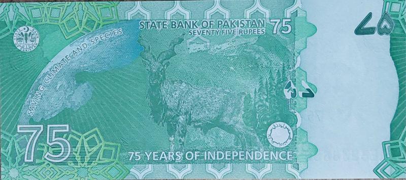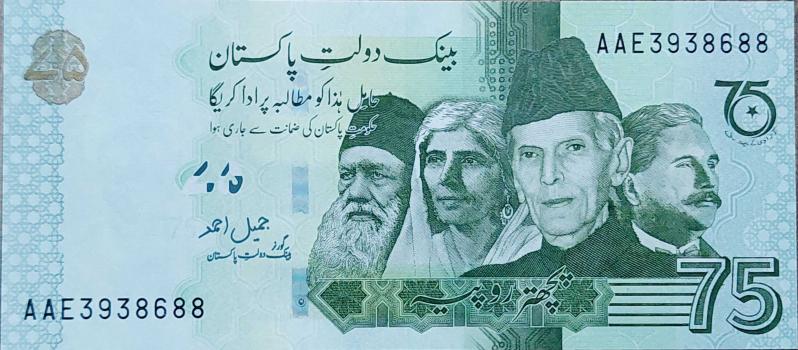 PAKİSTAN 75 Rupees, (Pakistan'ın Bağımsızlığının 75. Yıldönümü Hatıra Para) 2022 ÇİL FOTOĞRAFTA GÖRDÜĞÜNÜZ PARA YOLLANACAKTIR..