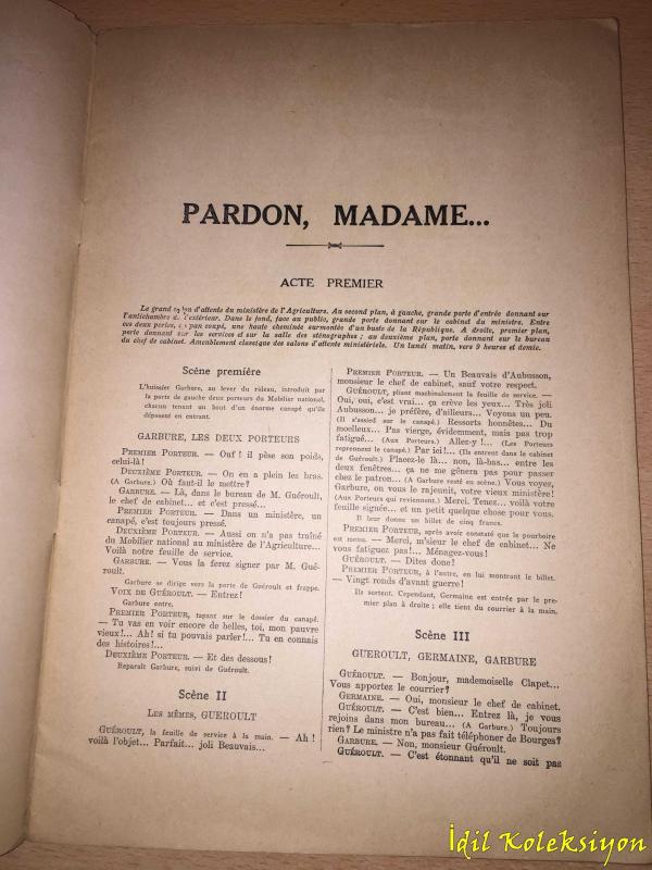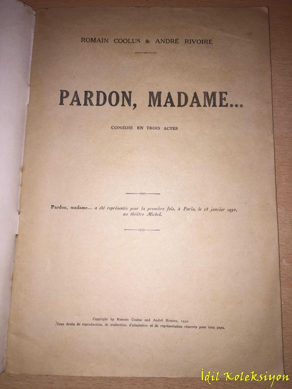 PARDON , MADAME .. : Comedie En Trois Actes - Romain Coolus & Andre Rivoire - Saint Georges - Fransızca (Affedin, MADAM..: Üç Perdede Komedi), Romain Coolus & Andre Rivoire tarafından kaleme alınmıştır. Eser - editörlüğünde hazırlanmıştır. Kitap 1930 yılında Saint Georges tarafından [Paris] - ISBN kodu ile yayınlanmıştır. Bu baskının çevirisi - tarafından yapılmıştır. 36 sayfadır. Sayfa bilgisi - olarak belirtilmiştir. PARDON , MADAME .. : Comedie En Trois Actes - Romain Coolus & Andre Rivoire - Saint Georges - Fransızca (Affedin, MADAM..: Üç Perdede Komedi) adlı eser Fransızca dilindedir.