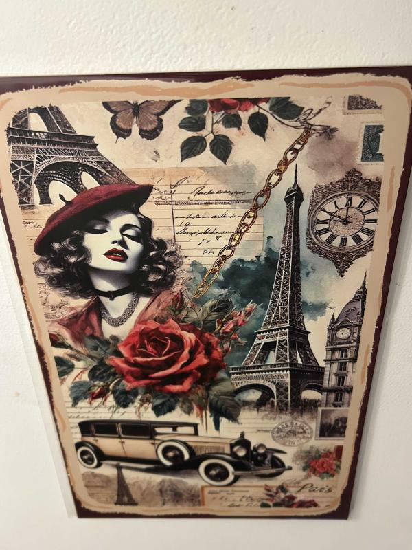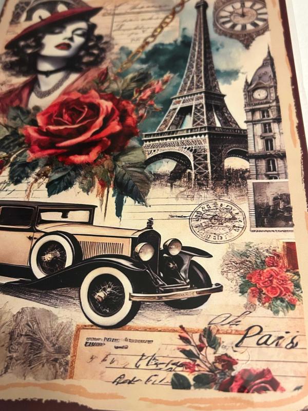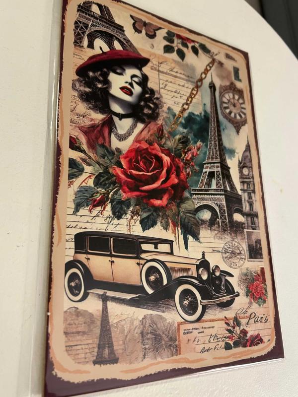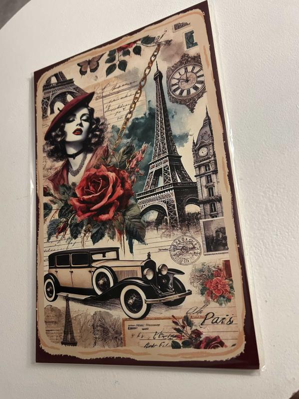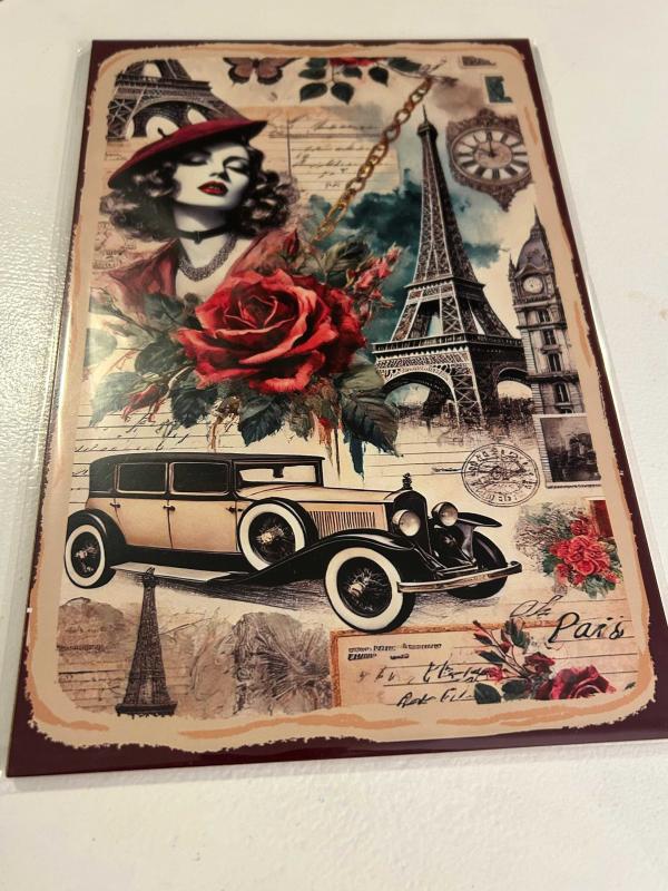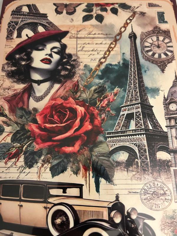 Fransa'nın başkenti Paris ile ilgili nostaljik öğelerin yer aldığı ahşap pano. Jelatinli ambalajı içinde. Boyutlar: En: 20 cm, Boy: 30 cm #paris #fransa #eyfelkulesi #klasikotomobil #nostaljikobje #ahşap #pano