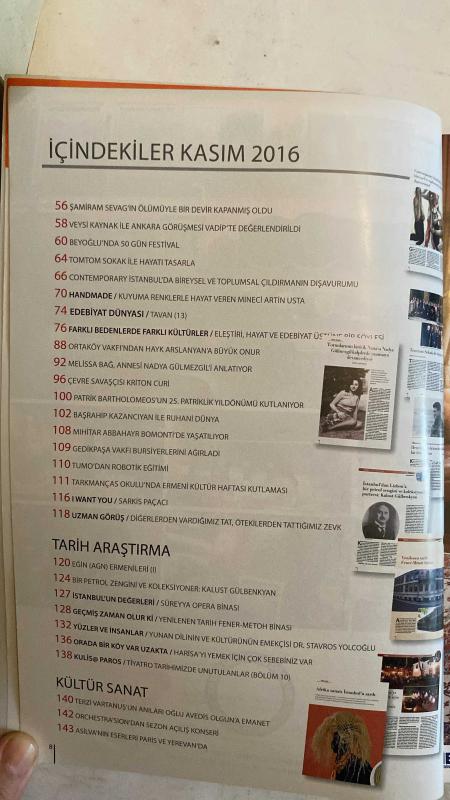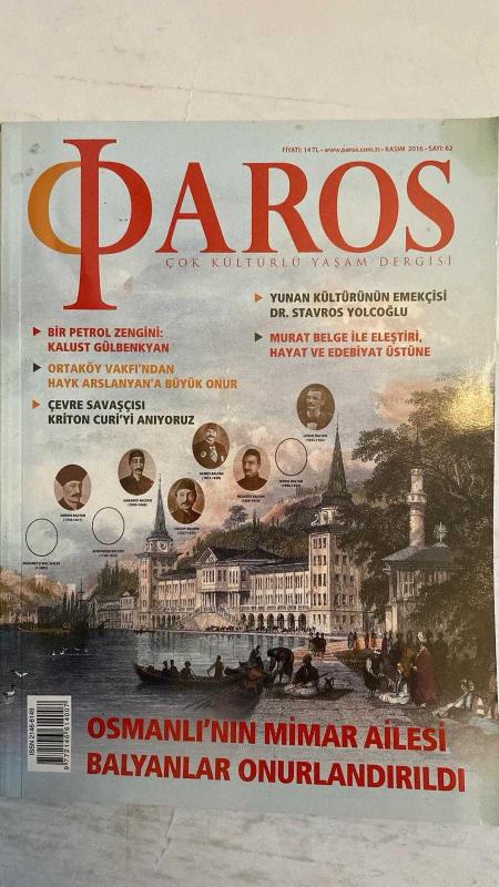 PAROS ÇOK KÜLTÜRLÜ YAŞAM DERGİSİ - KASIM 2016 SAYI: 62 KALUST GÜLBENKYAN - HAYK ARSLANYAN - KRİTON CURİ - DR. STAVROS YOLCOĞLU - MURAT BELGE - BALYAN AİLESİ (AKKOR BALYAN - SENEXENİM BALYAN - GARAGED BALYAN - SARKIS BALYAN - NGOGOS BALYAN - SİMON BALYAN - LEVON BALYAN) - ŞAMİRAM SEVAG - VEYSİ KAYNAK - MELİSSA BAĞ - NADYA GÜLMEZGİL - PATRİK BARTHOLOMEOS - BAŞRAHİP KAZANCIYAN - MIHITAR ABBAHAYR - SARKIS PAÇACI - ARTİN USTA - TERZİ VARTANUŞ - AVEDİS OLGUN - ASILVA - MARYAM ŞAHİNYAN - GÜLSİN ONAY - ARTUR BAĞDASARYAN - HERMAN ARTUÇ - LEYLA GENCER - MARIANNA VASILIADIS - MEHMET USTA BİR PETROL ZENGİNİ KALUST GÜLBENKYAN - ORTAKÖY VAKFI'NDAN HAYK ARSLANYAN'A BÜYÜK ONUR - ÇEVRE SAVAŞÇISI KRİTON CURİ - YUNAN KÜLTÜRÜNÜN EMEKÇİSİ DR. STAVROS YOLCOĞLU - MURAT BELGE İLE ELEŞTİRİ HAYAT VE EDEBİYAT - OSMANLI'NIN MİMAR AİLESİ BALYANLAR - ŞAMİRAM SEVAG'IN ÖLÜMÜ - ANKARA GÖRÜŞMESİ VADİP - BEYOĞLU'NDA 50 GÜN FESTİVAL - TOMTOM SOKAK İLE HAYATI TASARLA - CONTEMPORARY İSTANBUL– TAM TAKIM EKSİKSİZ 200 SAYFA, MAYDA SARİS tarafından kaleme alınmıştır. Eser TALİH ETYEMEZ editörlüğünde hazırlanmıştır. PAROS ÇOK KÜLTÜRLÜ YAŞAM DERGİSİ - KASIM 2016 SAYI: 62 KALUST GÜLBENKYAN - HAYK ARSLANYAN - KRİTON CURİ - DR. STAVROS YOLCOĞLU - MURAT BELGE - BALYAN AİLESİ (AKKOR BALYAN - SENEXENİM BALYAN - GARAGED BALYAN - SARKIS BALYAN - NGOGOS BALYAN - SİMON BALYAN - LEVON BALYAN) - ŞAMİRAM SEVAG - VEYSİ KAYNAK - MELİSSA BAĞ - NADYA GÜLMEZGİL - PATRİK BARTHOLOMEOS - BAŞRAHİP KAZANCIYAN - MIHITAR ABBAHAYR - SARKIS PAÇACI - ARTİN USTA - TERZİ VARTANUŞ - AVEDİS OLGUN - ASILVA - MARYAM ŞAHİNYAN - GÜLSİN ONAY - ARTUR BAĞDASARYAN - HERMAN ARTUÇ - LEYLA GENCER - MARIANNA VASILIADIS - MEHMET USTA BİR PETROL ZENGİNİ KALUST GÜLBENKYAN - ORTAKÖY VAKFI'NDAN HAYK ARSLANYAN'A BÜYÜK ONUR - ÇEVRE SAVAŞÇISI KRİTON CURİ - YUNAN KÜLTÜRÜNÜN EMEKÇİSİ DR. STAVROS YOLCOĞLU - MURAT BELGE İLE ELEŞTİRİ HAYAT VE EDEBİYAT - OSMANLI'NIN MİMAR AİLESİ BALYANLAR - ŞAMİRAM SEVAG'IN ÖLÜMÜ - ANKARA GÖRÜŞMESİ VADİP - BEYOĞLU'NDA 50 GÜN FESTİVAL - TOMTOM SOKAK İLE HAYATI TASARLA - CONTEMPORARY İSTANBUL– TAM TAKIM EKSİKSİZ 200 SAYFA adlı eser Türkçe dilindedir.