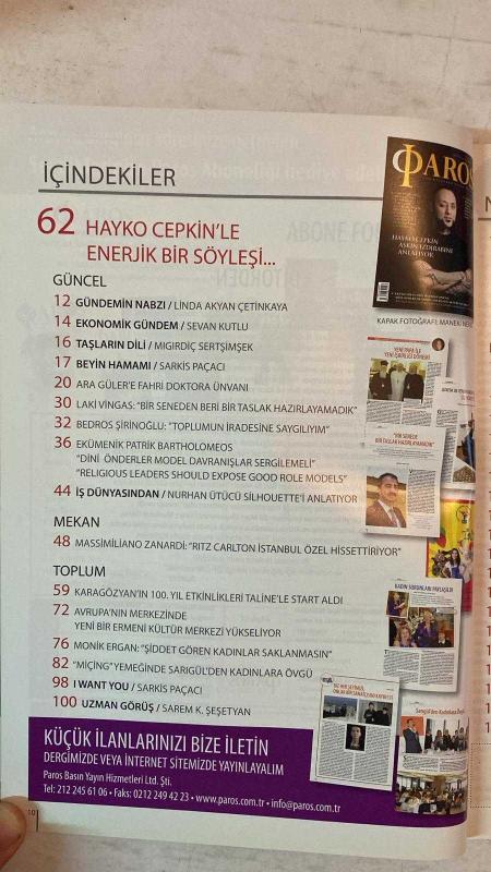 PAROS ÇOK KÜLTÜRLÜ YAŞAM DERGİSİ - NİSAN 2013 SAYI: 19 LAKİ VİNGAS - HAYKO CEPKİN - PASKAL TÖRENLİ - EKÜMENİK PATRİK BARTHOLOMEOS - MELODİ ÖZER - ARSEN YARMAN - TURGAY TUNA - LOLITA ASİL - DİLDİLİAN KARDEŞLER - ŞAHAN ARZRUNİ - ÖZLEM ERTAN - ALİN TAŞCİYAN - SİLVA BİNGAZ - AGOŞYAN - ARÇO KASPARYAN - ARET LAZOĞLU - GAREN - ARDA - ROMINA KUYUMCUOĞLU - SERLİ KEÇOĞLU - SELVİN PARUNAKYAN - LIANA YONTAN - LARA MUTLU - VARTAN PAÇACI - LINDA AKYAN ÇETİNKAYA - SEVAN KUTLU - MIGIRDİÇ SERTŞİMŞEK - SARKIS PAÇACI - ARA GÜLER - BEDROS ŞİRİNOĞLU - NURHAN ÜTÜCÜ - MASSIMILIANO ZANARDI - TALİNE - MONİK ERGAN - SARIGÜL - SAREM K. ŞEŞETYAN DEMOKRASİNİN VE BİRLİKTE VAROLUŞUN UNSURU OLARAK DİNİ AZINLIKLAR - AŞKIN IZDIRABI - TÜRKÇE ŞİİRLER YAZAN ERMENİ ŞAİRLER - DİNİ ÖNDERLER MODEL DAVRANIŞLAR SERGİLEMELİ - THE GATES OF CONSTANTINOPLE - ERMENİ TIP TARİHİ - BABA MARTA VE MARTENİTSİLER - ESKİ BAKIRKÖY VE YEŞİLKÖY PORTRELERİ - FOTOĞRAF KOLEKSİYONU - GUARDIANS OF THE LEGACY - ANUŞ O– TAM TAKIM EKSİKSİZ 172 SAYFA adlı eser, Kitap > Süreli Yayınlar > Dergiler > Otomobil kategorisinde İkinci El olarak satıştadır.