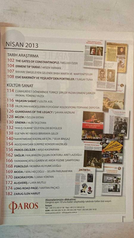 PAROS ÇOK KÜLTÜRLÜ YAŞAM DERGİSİ - NİSAN 2013 SAYI: 19 LAKİ VİNGAS - HAYKO CEPKİN - PASKAL TÖRENLİ - EKÜMENİK PATRİK BARTHOLOMEOS - MELODİ ÖZER - ARSEN YARMAN - TURGAY TUNA - LOLITA ASİL - DİLDİLİAN KARDEŞLER - ŞAHAN ARZRUNİ - ÖZLEM ERTAN - ALİN TAŞCİYAN - SİLVA BİNGAZ - AGOŞYAN - ARÇO KASPARYAN - ARET LAZOĞLU - GAREN - ARDA - ROMINA KUYUMCUOĞLU - SERLİ KEÇOĞLU - SELVİN PARUNAKYAN - LIANA YONTAN - LARA MUTLU - VARTAN PAÇACI - LINDA AKYAN ÇETİNKAYA - SEVAN KUTLU - MIGIRDİÇ SERTŞİMŞEK - SARKIS PAÇACI - ARA GÜLER - BEDROS ŞİRİNOĞLU - NURHAN ÜTÜCÜ - MASSIMILIANO ZANARDI - TALİNE - MONİK ERGAN - SARIGÜL - SAREM K. ŞEŞETYAN DEMOKRASİNİN VE BİRLİKTE VAROLUŞUN UNSURU OLARAK DİNİ AZINLIKLAR - AŞKIN IZDIRABI - TÜRKÇE ŞİİRLER YAZAN ERMENİ ŞAİRLER - DİNİ ÖNDERLER MODEL DAVRANIŞLAR SERGİLEMELİ - THE GATES OF CONSTANTINOPLE - ERMENİ TIP TARİHİ - BABA MARTA VE MARTENİTSİLER - ESKİ BAKIRKÖY VE YEŞİLKÖY PORTRELERİ - FOTOĞRAF KOLEKSİYONU - GUARDIANS OF THE LEGACY - ANUŞ O– TAM TAKIM EKSİKSİZ 172 SAYFA, MAYDA SARİS tarafından kaleme alınmıştır. Eser TALİH ETYEMEZ editörlüğünde hazırlanmıştır. PAROS ÇOK KÜLTÜRLÜ YAŞAM DERGİSİ - NİSAN 2013 SAYI: 19 LAKİ VİNGAS - HAYKO CEPKİN - PASKAL TÖRENLİ - EKÜMENİK PATRİK BARTHOLOMEOS - MELODİ ÖZER - ARSEN YARMAN - TURGAY TUNA - LOLITA ASİL - DİLDİLİAN KARDEŞLER - ŞAHAN ARZRUNİ - ÖZLEM ERTAN - ALİN TAŞCİYAN - SİLVA BİNGAZ - AGOŞYAN - ARÇO KASPARYAN - ARET LAZOĞLU - GAREN - ARDA - ROMINA KUYUMCUOĞLU - SERLİ KEÇOĞLU - SELVİN PARUNAKYAN - LIANA YONTAN - LARA MUTLU - VARTAN PAÇACI - LINDA AKYAN ÇETİNKAYA - SEVAN KUTLU - MIGIRDİÇ SERTŞİMŞEK - SARKIS PAÇACI - ARA GÜLER - BEDROS ŞİRİNOĞLU - NURHAN ÜTÜCÜ - MASSIMILIANO ZANARDI - TALİNE - MONİK ERGAN - SARIGÜL - SAREM K. ŞEŞETYAN DEMOKRASİNİN VE BİRLİKTE VAROLUŞUN UNSURU OLARAK DİNİ AZINLIKLAR - AŞKIN IZDIRABI - TÜRKÇE ŞİİRLER YAZAN ERMENİ ŞAİRLER - DİNİ ÖNDERLER MODEL DAVRANIŞLAR SERGİLEMELİ - THE GATES OF CONSTANTINOPLE - ERMENİ TIP TARİHİ - BABA MARTA VE MARTENİTSİLER - ESKİ BAKIRKÖY VE YEŞİLKÖY PORTRELERİ - FOTOĞRAF KOLEKSİYONU - GUARDIANS OF THE LEGACY - ANUŞ O– TAM TAKIM EKSİKSİZ 172 SAYFA adlı eser Türkçe dilindedir.