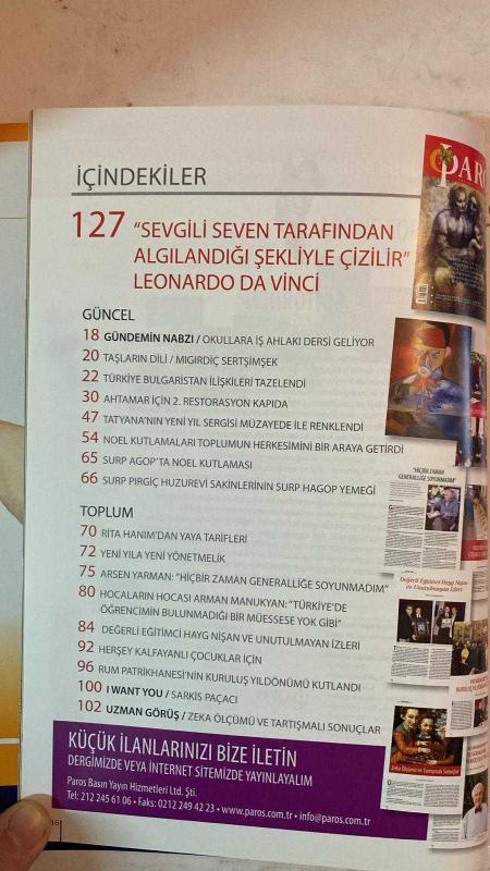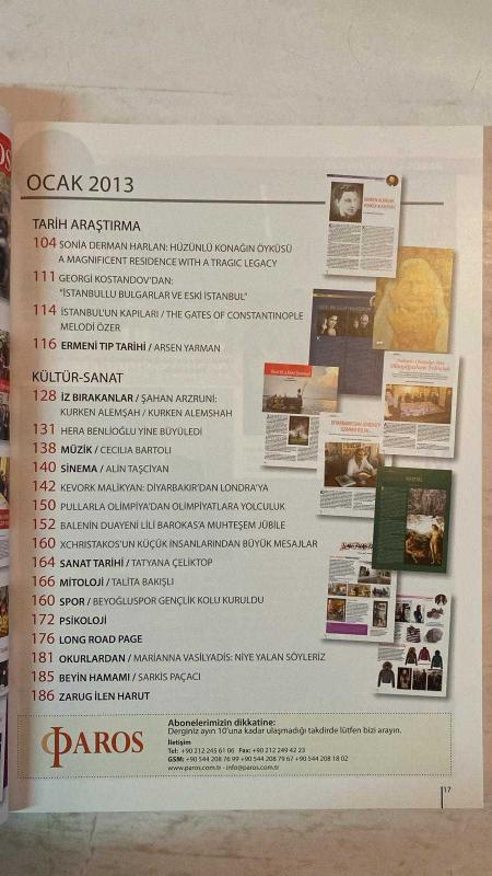 PAROS ÇOK KÜLTÜRLÜ YAŞAM DERGİSİ - OCAK 2013 SAYI: 16 MERYEM ANA - ÇOCUK İSA - AZİZE ANNA - ÇOCUK VAFTİZCİ YUHANNA - LEONARDO DA VİNCİ - LOLITA ASİL - SONIA DERMAN HARLAN - GEORGI KOSTANDOV - MELODİ ÖZER - ARSEN YARMAN - ŞAHAN ARZRUNİ - KURKEN ALEMŞAH - HERA BENLİOĞLU - CECILIA BARTOLI - ALİN TAŞCİYAN - KEVORK MALİKYAN - LİLİ BAROKAS - TATYANA ÇELİKTOP - TALITA BAKIŞLI - MARIANNA VASİLYADİS - SARKIS PAÇACI - ÖMER DİNÇER - MUSTAFA SARIGÜL - HARUN KAYA - VASKEN BARIN - MONİK BERKEL - MUAMMER YILDIZ - MEHMET ÖKLÜ - GÜRBÜZ AKBULUT - HAYR HAGOPOS ÇOPURYAN - ARMAN KAMAR - BERÇ MENZİLCİYAN - EVA ORAKYAN - KAREKİN BARSAMYAN YENİ YIL YENİ UMUTLAR YENİ BAŞLANGIÇ - NOEL BABA’DAN MEKTUP - EN RENKLİ EĞLENCELER GAZİNOLARDA - MISIR ÇARŞISI’NIN TOHUMCU STEFAN’I - CADILAR AKBİL KULLANIR - HÜZÜNLÜ KONAĞIN ÖYKÜSÜ - İSTANBULLU BULGARLAR VE ESKİ İSTANBUL - İSTANBUL’UN BİZANS SURLARI VE KAPILARI - ERMENİ TIP TARİHİ - BENİM ŞARKIM - HERA BENLİOĞLU YİNE BÜYÜLEDİ - MÜZİK - SİNEM– TAM TAKIM EKSİKSİZ 188 SAYFA, MAYDA SARİS tarafından kaleme alınmıştır. Eser TALİH ETYEMEZ editörlüğünde hazırlanmıştır. PAROS ÇOK KÜLTÜRLÜ YAŞAM DERGİSİ - OCAK 2013 SAYI: 16 MERYEM ANA - ÇOCUK İSA - AZİZE ANNA - ÇOCUK VAFTİZCİ YUHANNA - LEONARDO DA VİNCİ - LOLITA ASİL - SONIA DERMAN HARLAN - GEORGI KOSTANDOV - MELODİ ÖZER - ARSEN YARMAN - ŞAHAN ARZRUNİ - KURKEN ALEMŞAH - HERA BENLİOĞLU - CECILIA BARTOLI - ALİN TAŞCİYAN - KEVORK MALİKYAN - LİLİ BAROKAS - TATYANA ÇELİKTOP - TALITA BAKIŞLI - MARIANNA VASİLYADİS - SARKIS PAÇACI - ÖMER DİNÇER - MUSTAFA SARIGÜL - HARUN KAYA - VASKEN BARIN - MONİK BERKEL - MUAMMER YILDIZ - MEHMET ÖKLÜ - GÜRBÜZ AKBULUT - HAYR HAGOPOS ÇOPURYAN - ARMAN KAMAR - BERÇ MENZİLCİYAN - EVA ORAKYAN - KAREKİN BARSAMYAN YENİ YIL YENİ UMUTLAR YENİ BAŞLANGIÇ - NOEL BABA’DAN MEKTUP - EN RENKLİ EĞLENCELER GAZİNOLARDA - MISIR ÇARŞISI’NIN TOHUMCU STEFAN’I - CADILAR AKBİL KULLANIR - HÜZÜNLÜ KONAĞIN ÖYKÜSÜ - İSTANBULLU BULGARLAR VE ESKİ İSTANBUL - İSTANBUL’UN BİZANS SURLARI VE KAPILARI - ERMENİ TIP TARİHİ - BENİM ŞARKIM - HERA BENLİOĞLU YİNE BÜYÜLEDİ - MÜZİK - SİNEM– TAM TAKIM EKSİKSİZ 188 SAYFA adlı eser Türkçe dilindedir.