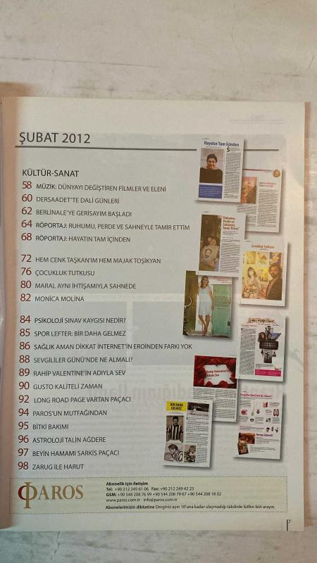 PAROS ÇOK KÜLTÜRLÜ YAŞAM DERGİSİ - ŞUBAT 2012 SAYI: 5 MAYA PORTAKAL - ARSEN YARMAN - TURGAY TUNA - ELENİ - CENK TAŞKAN - MAJAK TOŞİKYAN - MARAL - MONICA MOLINA - TALİN AĞDERE - SARKIS PAÇACI - VARTAN PAÇACI - HRANT DİNK - KARİN KARAKAŞLI - MUSTAFA SARIGÜL - ALFRED - FOTİ HRİSTİDİS ÜNLÜ TASARIMLARI İSTANBUL’A TAŞIDI - ASIL KARNAVAL’DAN BÜYÜK ORUÇ’A - GOMİDAS’IN SON EVİ - HRANT’IN YAŞADIĞININ İLAMI - YUNAN’IN UMUDU SUYUN BU YAKASI - NOEL VE VAFTİZ - DZINUNT KUTLAMALARI - DETROIT’TE DANSÖZLÜ YILBAŞI - BULGAR KARNAVALI - YILIN İLK SEVGİ SOFRASI - SİYASET PİYANGOSU - ESKİ İSTANBUL’A YOLCULUK - ALFRED’İN DİYECEKLERİ VAR - RÜYA ÜLKESİ HİNDİSTAN - ESKİ BAKIRKÖY VE YEŞİLKÖY PORTRELERİ - DÜNYAYI DEĞİŞTİREN FİLMLER - DERSAADET’TE DALİ GÜNLERİ - BERLİNALE’YE GERİSAYIM - RUHUMU PERDE VE SAHNEYLE TAMİR ETTİM - HAYATIN TAM İÇİNDEN - ÇOCUKLUK TUTKUSU - MARAL SAHNEDE - SINAV KAYGISI - LEFTER: BİR DAHA GELMEZ - İNTERNET’İN EROİNDEN FARKI YOK - SEVGİLİLER GÜNÜ’NDE NE ALMA – TAM TAKIM EKSİKSİZ 100 SAYFA, MAYDA SARİS tarafından kaleme alınmıştır. Eser TALİH ETYEMEZ editörlüğünde hazırlanmıştır. PAROS ÇOK KÜLTÜRLÜ YAŞAM DERGİSİ - ŞUBAT 2012 SAYI: 5 MAYA PORTAKAL - ARSEN YARMAN - TURGAY TUNA - ELENİ - CENK TAŞKAN - MAJAK TOŞİKYAN - MARAL - MONICA MOLINA - TALİN AĞDERE - SARKIS PAÇACI - VARTAN PAÇACI - HRANT DİNK - KARİN KARAKAŞLI - MUSTAFA SARIGÜL - ALFRED - FOTİ HRİSTİDİS ÜNLÜ TASARIMLARI İSTANBUL’A TAŞIDI - ASIL KARNAVAL’DAN BÜYÜK ORUÇ’A - GOMİDAS’IN SON EVİ - HRANT’IN YAŞADIĞININ İLAMI - YUNAN’IN UMUDU SUYUN BU YAKASI - NOEL VE VAFTİZ - DZINUNT KUTLAMALARI - DETROIT’TE DANSÖZLÜ YILBAŞI - BULGAR KARNAVALI - YILIN İLK SEVGİ SOFRASI - SİYASET PİYANGOSU - ESKİ İSTANBUL’A YOLCULUK - ALFRED’İN DİYECEKLERİ VAR - RÜYA ÜLKESİ HİNDİSTAN - ESKİ BAKIRKÖY VE YEŞİLKÖY PORTRELERİ - DÜNYAYI DEĞİŞTİREN FİLMLER - DERSAADET’TE DALİ GÜNLERİ - BERLİNALE’YE GERİSAYIM - RUHUMU PERDE VE SAHNEYLE TAMİR ETTİM - HAYATIN TAM İÇİNDEN - ÇOCUKLUK TUTKUSU - MARAL SAHNEDE - SINAV KAYGISI - LEFTER: BİR DAHA GELMEZ - İNTERNET’İN EROİNDEN FARKI YOK - SEVGİLİLER GÜNÜ’NDE NE ALMA – TAM TAKIM EKSİKSİZ 100 SAYFA adlı eser Türkçe dilindedir.