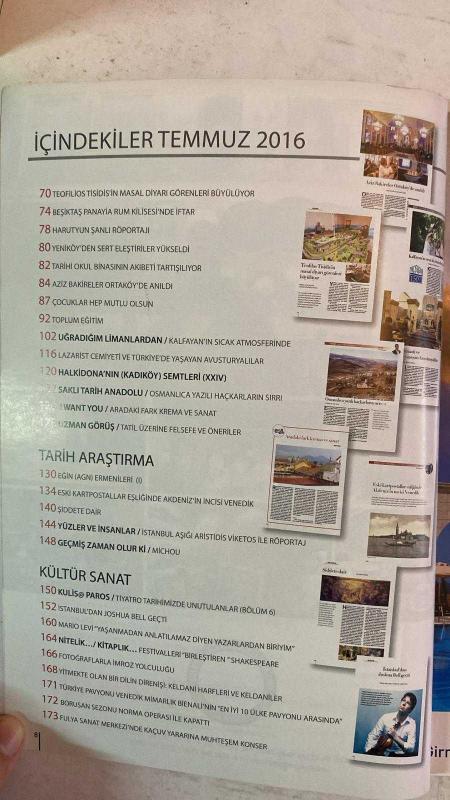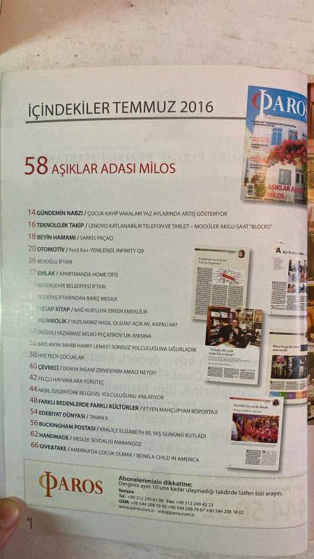 PAROS ÇOK KÜLTÜRLÜ YAŞAM DERGİSİ - TEMMUZ 2016 SAYI: 58 MARIO LEVİ - ETYEN MAHÇUPYAN - JOSHUA BELL - NECİL ÖZGENTÜRK - MILKO PEÇATİKOV - HARRY LENAS - TEOFILIOS TİSİDİS - HARUTYUN ŞANLI - ARISTIDIS VIKETOS - SARKIS PAÇACI YAŞANMADAN ANLATILAMAZ DİYEN YAZARLARDAN BİRİYİM - TİMARHANE GÜNLERİNİ ANLATIYOR - OSMANLICA YAZILI HAÇKARLARIN SIRRI - AKDENİZ'İN İNCİSİ VENEDİK - İSTANBUL'DAN JOSHUA BELL GEÇTİ - EĞİN ERMENİLERİ - KELDANİ HARFLERİ VE KELDANİLER - BELGESEL YOLCULUĞU - AŞIKLAR ADASI MİLOS - ÇOCUK KAYIP VAKALARI - LENOVO KATLANABİLİR TELEFON - FORD KA+ - BEYOĞLU İFTARI - BEŞİKTAŞ İFTARI - ERKEN EMEKLİLİK - YAZILIMINIZ NASIL OLSUN - BAYLAN'IN SAHİBİNE VEDA - HYE TECH ÇOCUKLAR - DÜNYA İNSANI ZİRVESİ - FELÇLİ HAYVANLARA YÜRÜTEÇ - RÖPORTAJ - BUCKINGHAM POSTASI KRALİÇE ELIZABETH 90 YAŞINDA - MESLEK SEVDALISI MARANGOZ - AMERİKA'DA ÇOCUK OLMAK - MASAL DİYARI - BEŞİKTAŞ PANAYİA RUM KİLİSESİ'NDE İFTAR - YENİKÖY ELEŞTİRİLERİ - TARİHİ OKUL BİNASI - AZİZ BAKİRELER O– TAM TAKIM EKSİKSİZ 228 SAYFA, MAYDA SARİS tarafından kaleme alınmıştır. Eser TALİH ETYEMEZ editörlüğünde hazırlanmıştır. PAROS ÇOK KÜLTÜRLÜ YAŞAM DERGİSİ - TEMMUZ 2016 SAYI: 58 MARIO LEVİ - ETYEN MAHÇUPYAN - JOSHUA BELL - NECİL ÖZGENTÜRK - MILKO PEÇATİKOV - HARRY LENAS - TEOFILIOS TİSİDİS - HARUTYUN ŞANLI - ARISTIDIS VIKETOS - SARKIS PAÇACI YAŞANMADAN ANLATILAMAZ DİYEN YAZARLARDAN BİRİYİM - TİMARHANE GÜNLERİNİ ANLATIYOR - OSMANLICA YAZILI HAÇKARLARIN SIRRI - AKDENİZ'İN İNCİSİ VENEDİK - İSTANBUL'DAN JOSHUA BELL GEÇTİ - EĞİN ERMENİLERİ - KELDANİ HARFLERİ VE KELDANİLER - BELGESEL YOLCULUĞU - AŞIKLAR ADASI MİLOS - ÇOCUK KAYIP VAKALARI - LENOVO KATLANABİLİR TELEFON - FORD KA+ - BEYOĞLU İFTARI - BEŞİKTAŞ İFTARI - ERKEN EMEKLİLİK - YAZILIMINIZ NASIL OLSUN - BAYLAN'IN SAHİBİNE VEDA - HYE TECH ÇOCUKLAR - DÜNYA İNSANI ZİRVESİ - FELÇLİ HAYVANLARA YÜRÜTEÇ - RÖPORTAJ - BUCKINGHAM POSTASI KRALİÇE ELIZABETH 90 YAŞINDA - MESLEK SEVDALISI MARANGOZ - AMERİKA'DA ÇOCUK OLMAK - MASAL DİYARI - BEŞİKTAŞ PANAYİA RUM KİLİSESİ'NDE İFTAR - YENİKÖY ELEŞTİRİLERİ - TARİHİ OKUL BİNASI - AZİZ BAKİRELER O– TAM TAKIM EKSİKSİZ 228 SAYFA adlı eser Türkçe dilindedir.