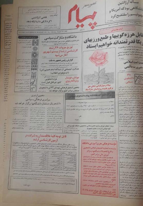 PAYAME DANESHJOUYE BASEEJİ VOL 1 NO.1 MONDAY AUGUST 29 1994 CİLT HALİNDE (TOPLAM 516 SAYFA FARSÇA GAZETE) başlıklı ürün, Efemera, Müzik, Sinema > Belge ve Evraklar > Gazete kategorisi altında İkinci El olarak satılmaktadır.