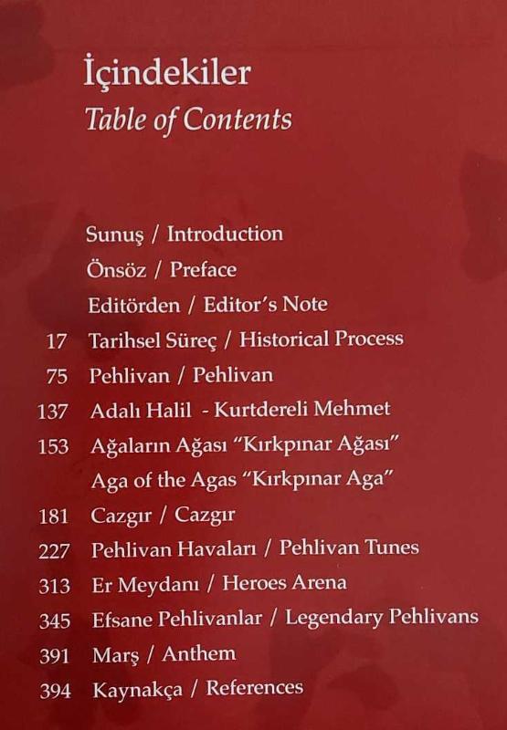 TÜRKÇE - İNGİLİZCE KARŞILIKLI METİN. İçindekiler: Tarihsel Süreç, Pehlivan, Adalı Halil, Ağaların ağası Kırkpınar Ağası, Cazgır, Pehlivan Havaları, Er Meydanı, Efsane Pehlivanlar, Marş. Kuşe kağıda lüks baskı. Metinde bol fotoğraf. Orijinal şömizli bez cildinde.