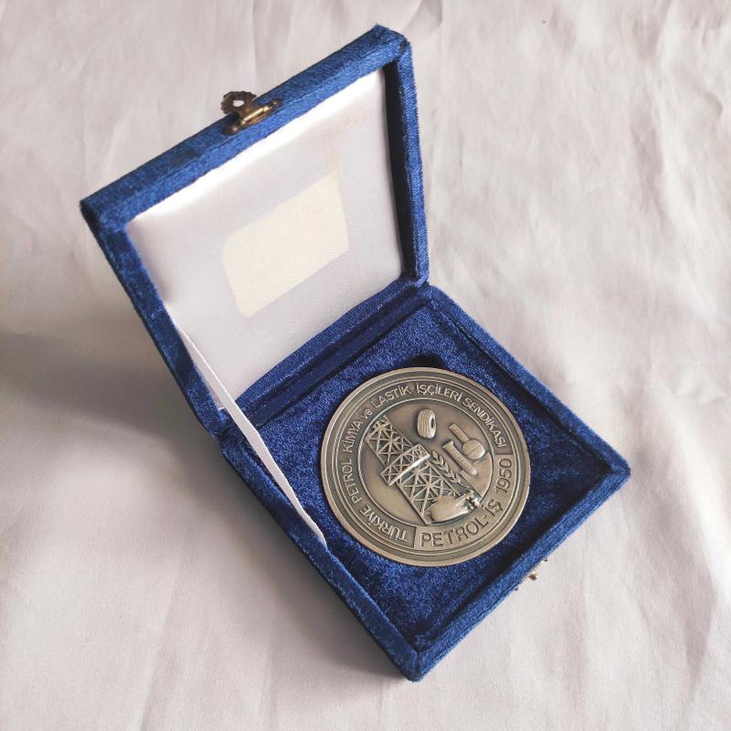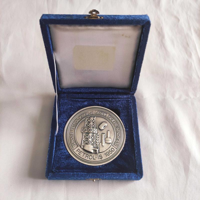 * * PETROL-İŞ SENDİKASI 1950 HATIRA MADALYON * * * * Türkiye Petrol Kimya ve Lastik İşçileri Sendikası * * - Lacivert kadife kaplı kutu içerisinde hatıra anı madalyonu. - Nikel materyal üzeri okside gümüş kaplama. - Numismatik olarak koleksiyon değeri olan ve para kataloglarında ismi geçen madalyondur. - Kutu Ölçüsü: 10,5 x 10,5 x 2,5 cm. - Madalyon Çapı: 7,9 cm. Ağırlık: 200 gr. - Madalya neredeyse kusursuz kondisyonda, temiz, sağlam koleksiyonluk obje. - Kondisyon detaylı göstermeye çalıştığım fotoğraflardadır. - Kadife kaplı kutunun iç yüzünde etiket lekesi mevcuttur. * * Ürünlerim hakkında her türlü soru, şüphe ve görüşleriniz için lütfen benimle irtibata geçmekten çekinmeyiniz. * * -