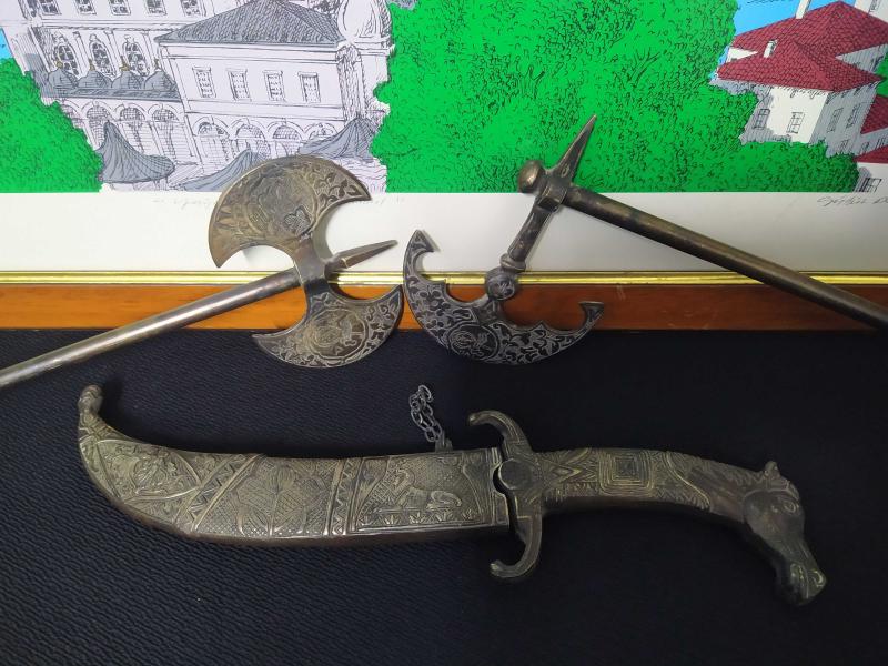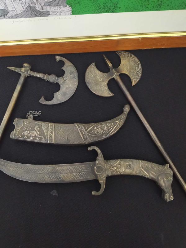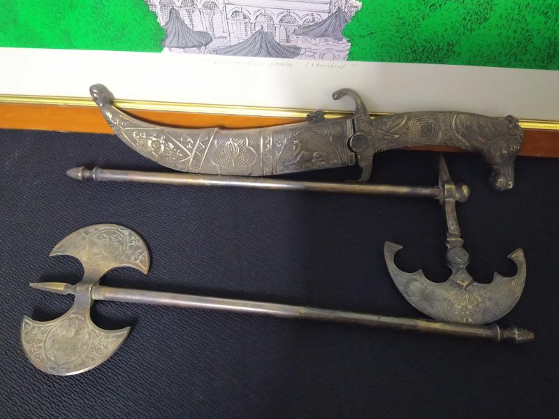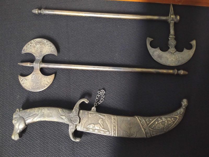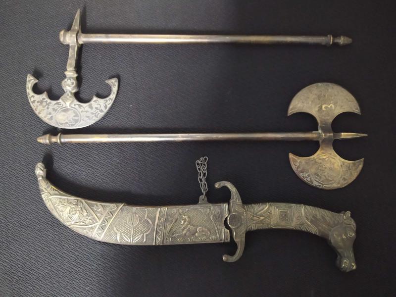 PİİRNÇ MADENİ TOK PARÇALARDIR. İŞÇİLİKLERİ ÇOK İYİDİR. 2 ADET TEBER CE 1 ADET KAMA İLE TOPLAM 3 PARÇADIR. TEK TARAFLI TEBER 36 CM , ÇİFT TARAFLI TEBER 33 CM DIR.