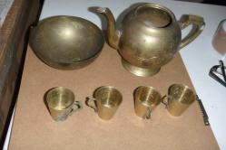PİRİNÇ METAL TAKIM ÇAYDANLIK MİNİK BARDAKLARI ŞEKERLİĞİ SÜS OBCESİ başlıklı antika/koleksiyon objesinin menşei belirtilmemiştir. Objenin ait olduğu dönem bilinmeketedir.