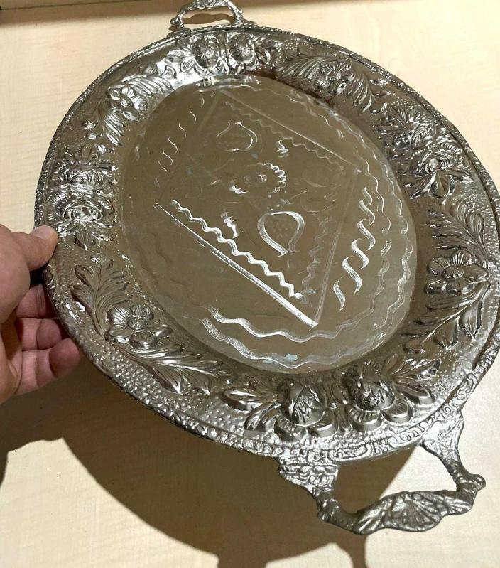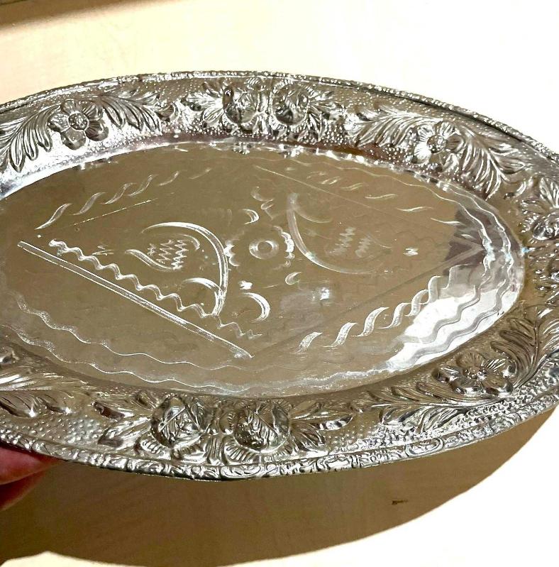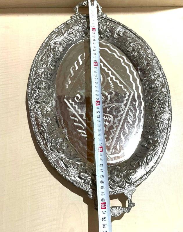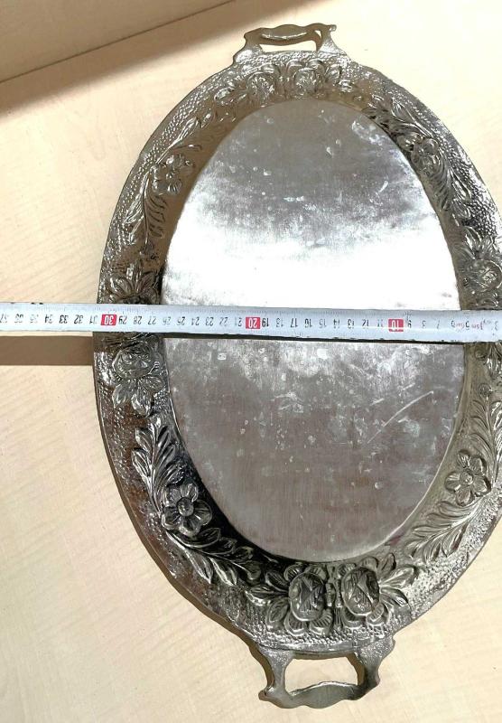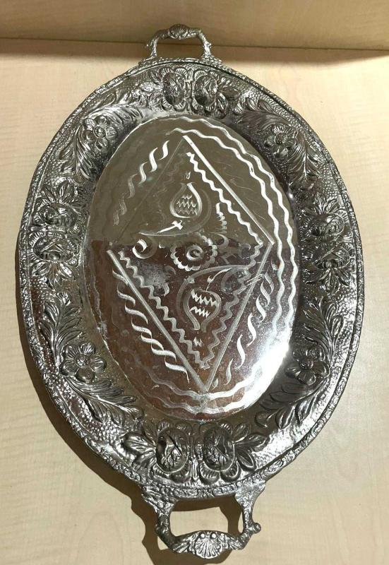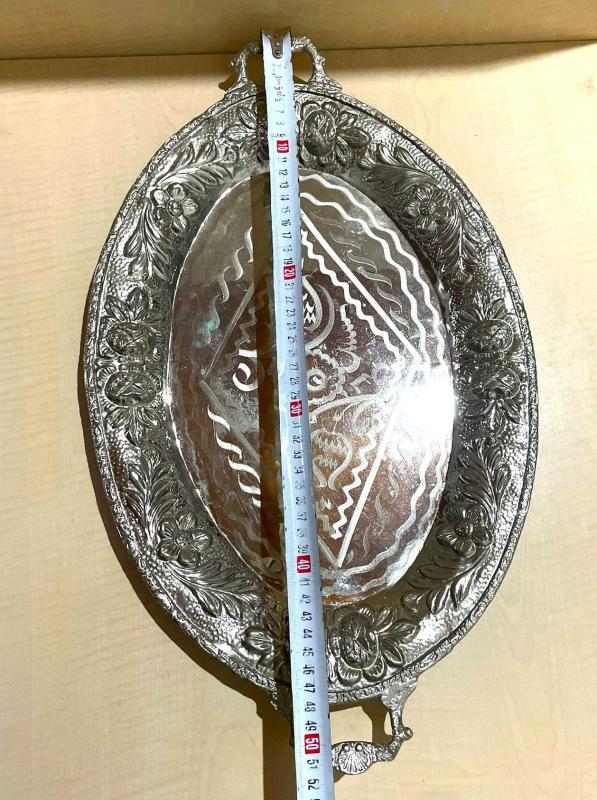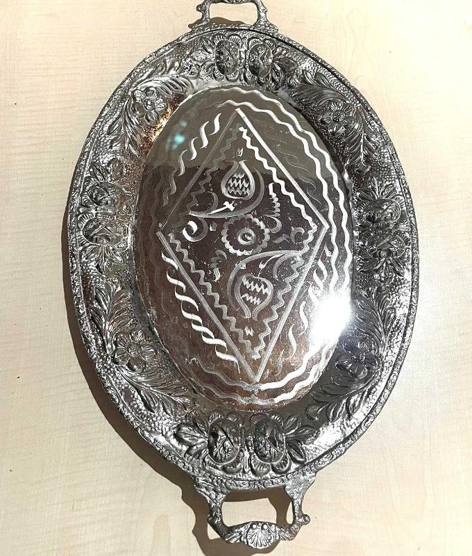 PİRİNÇ ÜZERİ GÜMÜŞ KAPLAMA TEPSİ başlıklı antika/koleksiyon objesi Türkiye menşe’lidir. 1960-1979 arası dönemine aittir.