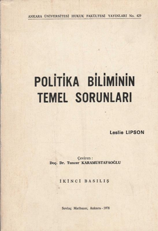 POLİTİKA BİLİMİNİN TEMEL SORUNLARI, Leslie Lipson tarafından kaleme alınmıştır. Kitap 1978 yılında Ankara Üniversitesi Hukuk Fakültesi Yayınları tarafından [Ankara] yayınlanmıştır. Bu baskının çevirisi Tuncer Karamustafaoğlu tarafından yapılmıştır. 529 sayfadır. POLİTİKA BİLİMİNİN TEMEL SORUNLARI adlı eser Türkçe dilindedir.