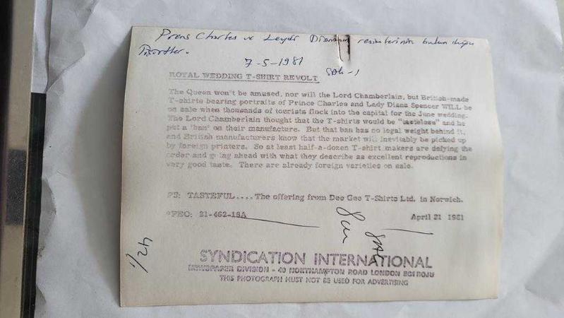 PRENSES DIANA'NIN ORİJİNAL FOTOĞRAFI - ORIGINAL PHOTOGRAPH OF PRINCESS DIANA - 20 x 15 cm EBADINDA - KRALİÇE BUNDAN HİÇ HOŞLANMAYACAK, LORD CHAMBERLAİN DE ÖYLE, AMA PRENS CHARLES VE LADY DİANA SPENCER'IN PORTRELERİNİ TAŞIYAN İNGİLİZ YAPIMI TİŞÖRTLER, HAZİRAN AYINDAKİ DÜĞÜN İÇİN BAŞKENTE AKIN EDECEK BİNLERCE TURİST İÇİN SATIŞTA OLACAK. NORWİCH'TEKİ DEE GEE T-SHİRTS LTD. FİRMASININ ÜRÜNÜ. 1981 - THE QUEEN WON'T BE AMUSED, NOR WILL BE THE LORD CHAMBERLAIN, BUT BRITISH-MADE T-SHIRTS BEARING PORTRAITS OF PRINCE CHARLES AND LADY DIANA SPENCER WILL BE ON SALE WHEN THOUSANDS OF TOURISTS FLOCK INTO THE CAPITAL FOR THE JUNE WEDDING. THE OFFERING FROM DEE GEE T-SHIRTS LTD. IN NORWICH. 1981, en son 24 gün önce güncellenmiştir.