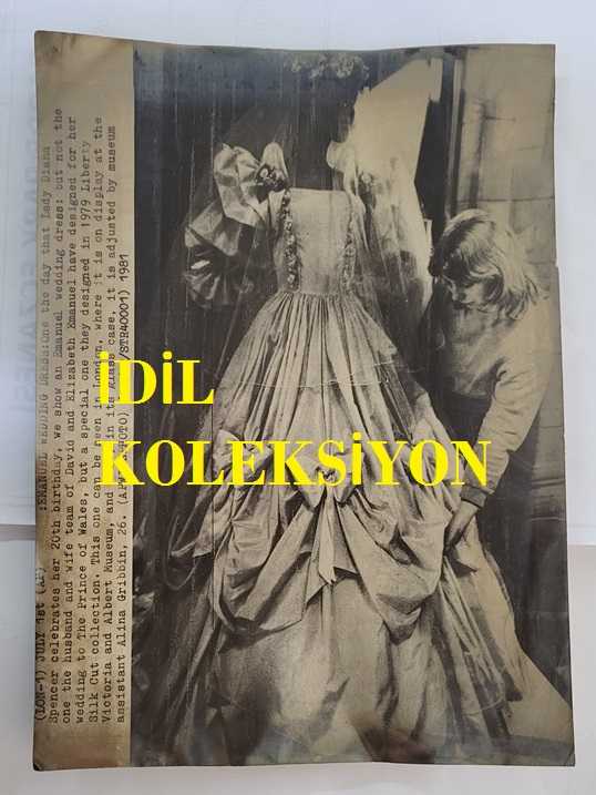 PRENSES DIANA'NIN ORİJİNAL HABER AJANSI BASIM FOTOĞRAFI - NEWS AGENCY PHOTO OF PRINCESS DIANA - 25 x 18 cm EBADINDA - LADY DİANA SPENCER'IN 20. DOĞUM GÜNÜNÜ KUTLADIĞI GÜNDE, BİR EMANUEL GELİNLİĞİ GÖSTERİYORUZ: ANCAK BU, DAVİD VE ELİZABETH EMANUEL'İN GALLER PRENSİ İLE EVLİLİĞİ İÇİN TASARLADIĞI GELİNLİK DEĞİL, 1979 LİBERTY SİLK CUT KOLEKSİYONUNDA TASARLADIKLARI ÖZEL BİR GELİNLİK. BU GELİNLİK, LONDRA'DAKİ VİCTORİA VE ALBERT MÜZESİ'NDE SERGİLENİYOR VE BURADA, CAM VİTRİNİNDE, 26 YAŞINDAKİ MÜZE ASİSTANI ALİNA GRİBBİN. - ONE THE DAY THAT LADY DIANA SPENCER CELEBRATES HER 20TH BIRTHDAY, WE SHOW AN EMANUEL WEDDING DRESS: BUT NOT THE ON THE HUSBAND AND WIFE TEAM OF DAVID AND ELIZABETH EMANUEL HAVE DESIGNED FOR HER WEDDING TO THE PRINCE OF WALES, BUT A SPECIAL ONE THEY DESIGNED IN 1979 LIBERTY SILK CUT COLLECTION. THIS ONE CAN BE SEEN IN LONDON, WHERE IT IS ON DISPLAY AT THE VICTORIA AND ALBERT MUSEUM, AND HERE, IN ITS GLASS CASE, IT IS ADJUSTED BY MUSEUM ASSISTANT ALINA GRIBBIN, 26... 1981, en son 26 gün önce güncellenmiştir.
