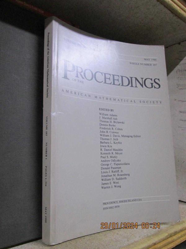 PROCEEDINGS OF THE AMERICAN MATHEMATICAL SOCIETY VOLUME 103 NUMBER 1 PAGES 1 - 334 MAY 1988 - EDITED BY WILLIAM ADAMS, JÇ MARSHALL ASH, THOMAS H. BRYLAWSKİ, DENNIS BURKE, FREDERICK R. COHEN, JOHN B. CONWAY, WILLIAM J. DAVID, THOMAS J. JECH, BARBARA L. KEYFITZ, IRWIN KRA, R. DANIEL MAULDIN, KENNETH R. MEYER, PAUL S. MUHLY, ANDREW ODLYZKO, GEORGE C. PAPANICOLAOU, DONALD PASSMAN, LOUIS J. RATLIFF, JONATHAN M. ROSENBERG, WILLIAM D. SUDDERTH, JAMES E. WEST, WARREN J. WONG..336 SAYFA..ÇOK TEMİZ.