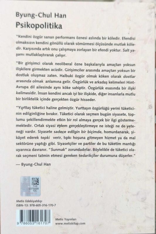 PSİKOPOLİTİKA NEOLİBERALİZM VE YENİ İKTİDAR TEKNİKLERİ, BYUNG-CHUL HAN tarafından kaleme alınmıştır. Kitap 2025 yılında METİS YAYINLARI tarafından yayınlanmıştır. 98 sayfadır. PSİKOPOLİTİKA NEOLİBERALİZM VE YENİ İKTİDAR TEKNİKLERİ adlı eser Türkçe dilindedir.