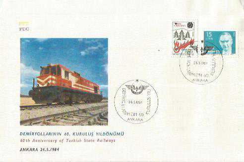 PTT İLK GÜN ZARFI - DEMİRYOLLARININ 60. KURULUŞ YILDÖNÜMÜ TEMALI - ANKARA 24.5.1984 - ÇİFT PULLU ÇİFT KAŞELİ