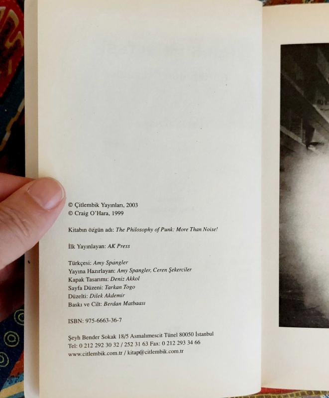 PUNK FELSEFESİ "Gürültünün Ötesinde", CRAIG O'HARA tarafından kaleme alınmıştır. Kitap 2003 yılında ÇİTLEMBİK YAYINLARI tarafından [İSTANBUL] yayınlanmıştır. Satışta olan kitap, yayınevinin 1. baskısıdır. Bu baskının çevirisi AMY SPANGLER tarafından yapılmıştır. 168 sayfadır. PUNK FELSEFESİ "Gürültünün Ötesinde" adlı eser Türkçe dilindedir.