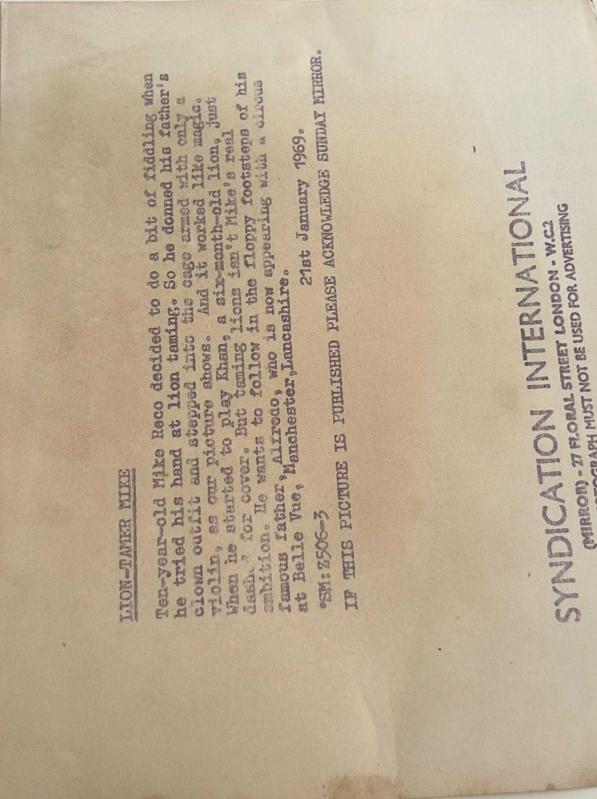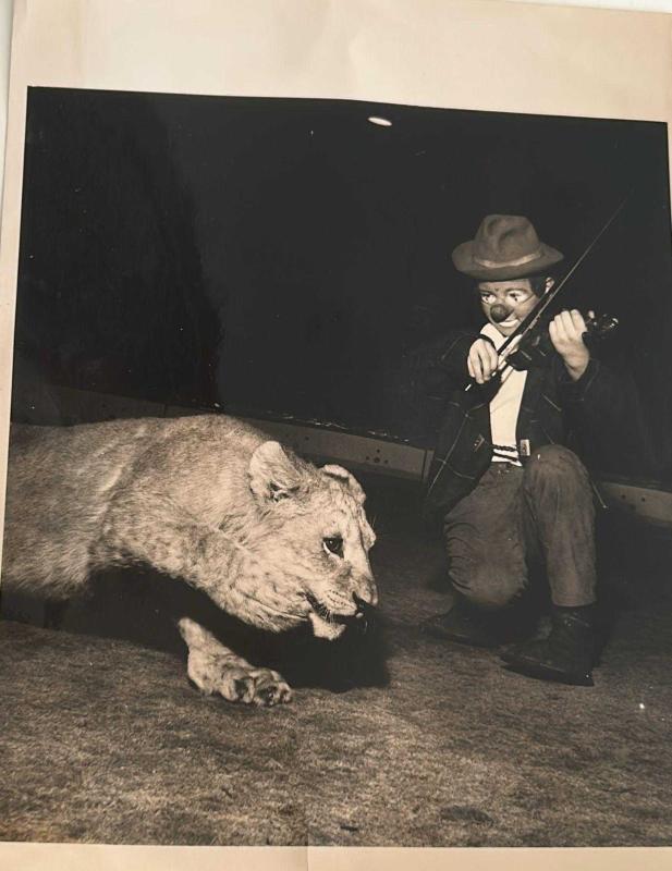 Palyoça kıyafeti giyip bir aslanın yanında keman çalarken çekilmiş olan yetişkin erkek fotoğrafı.ORJİNAL SİYAH & BEYAZ 23x18cm EBADINDA - 1940'LAR, 1950'LER, 1960'LAR ve 1970'LER