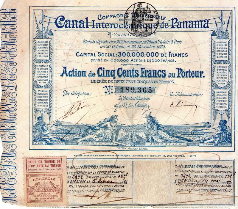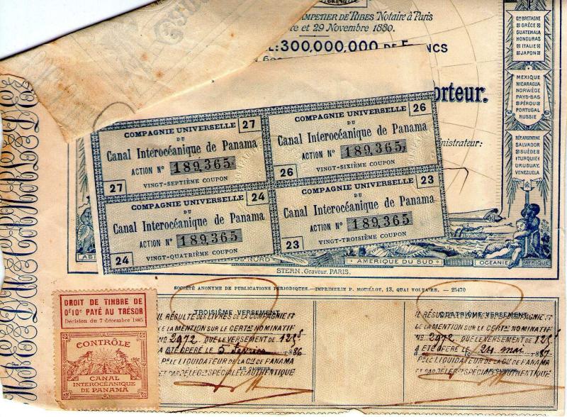 TARİHE TANIKLIK EDEN BELGELERDENDİR.kuponlar 4 tanedir.. 1880 Panama Canal French Bond on watermarked paper. Compagnie Universelle Canal Interoceanique de Panama bond issued for the building of the Panama Canal, (2) 1885 10c Canal Fiscals indicating 1887 payments tied by the apropriate handstamps, additional red German Fiscal printed on document. The French abandoned the building of the Canal after many workers contracted Yellow Fever and died. Fresh with minor edge faults, few staple holes. Reverse: blank. Size: 7½" x 7¼".