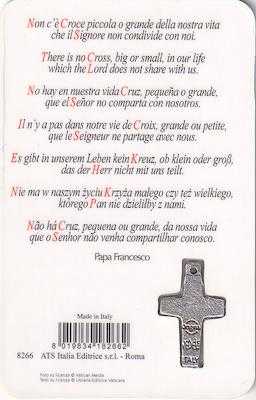 Papa Francesco’ya (Papa Francis) atfedilen bir sözün yer aldığı dini hatıra/dua kartı ve yanında küçük bir haç (kolye ucu) • Kartta şu anlamda bir söz yazıyor: “Hayatımızda, büyük ya da küçük, Rab’bin bizimle paylaşmadığı hiçbir çarmıh yoktur.” • Alt kısımda Papa Francesco’nun imzası (basılı) görünüyor. • Sağ altta İtalya’da üretilmiş metal bir haç yer alıyor. • Vatikan hac hatırası