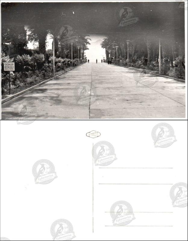 Park Yolu, Fotoğraf, 1950’ler: Palmiye ağaçlarıyla çevrili geniş bir yürüyüş yolunda, uzakta yürüyen insan figürleriyle perspektifli görünüm. başlıklı ürün, Efemera, Müzik, Sinema > Fotoğraflar > Diğer kategorisi altında İkinci El olarak satılmaktadır.