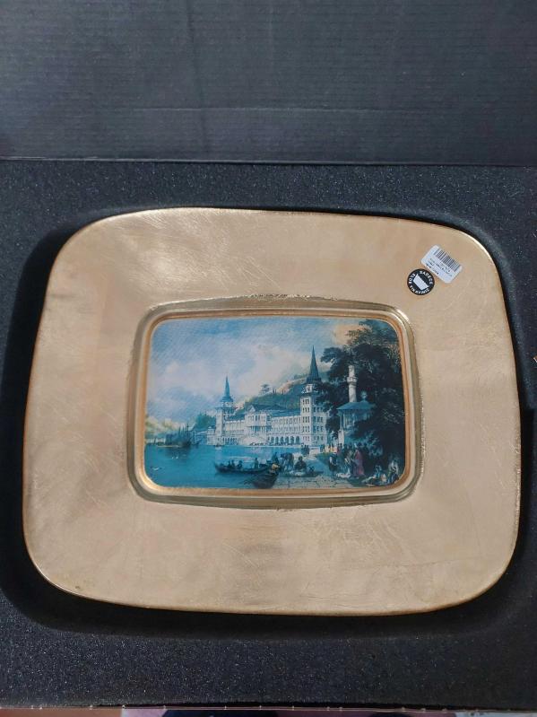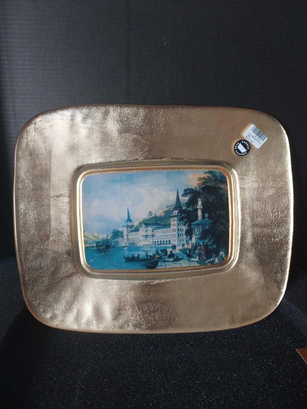 Kuleli Gravürlü Küçük Tabak Tabağı ayakta tutan plastik tutucu yok Resimler de gözüken orjinal kutusu ile gönderilecek Şuan piyasada olmayan bir ürün