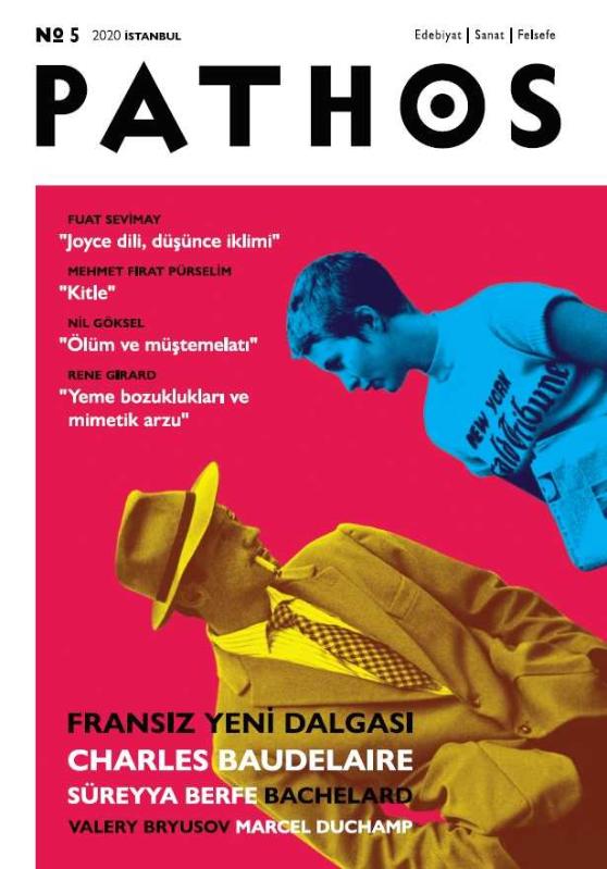 PATHOS NO. 5 Osman Çakmakçı - Türk entelektüelinin trajedisi ŞİİR Charles Baudelaire Özel Bölümü, Baudelaire’in Annesine Mektubu Çağdaş Türk Şiiri - Süreyya Berfe, Serdar Koçak, Yücel Kayıran, İrfan Yıldız, Ender Emiroğlu, Cengiz Kılçer, Cenk Gündoğdu, Onur Sakarya, Onur Köybaşı, Kaan Koç, Talita Yaltırık DENEME Noah Berlatsky – Şiir birçok şairin dediği kadar faydasız değildir Fuat Sevimay – Joyce dili, düşünce iklimi René Girard – Yeme bozuklukları ve mimetik arzu ÖYKÜ Mehmet Fırat Pürselim - Kitle Şeyma Yol Kara – Yolculuğa çıkmış düşünceler üzerine Valery Bryusov – Maecenas’da DOSYA: FRANSIZ YENİ DALGASI Taner Ay – Yeni Dalga: Seyretme fikrinin hazzı SANAT Özlem Kalkan Erenus – Marcel Duchamp’da alegorik döngü Cihan Camcı – Giacometti, Beckett, Kâtip Bartleby: İstemli yapmayış ve yürüyen adam Zehra İpşiroğlu – Bir delinin hatıra defteri Ali Salduz – Ay, Carmela! FELSEFE Nil Göksel – Ölüm ve müştemelatı Özgür Taburoğlu – Yaşam hamlesine karşı durma felsefesi: Bergson ve Bachelard