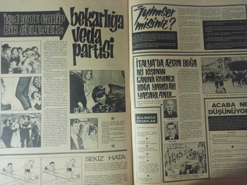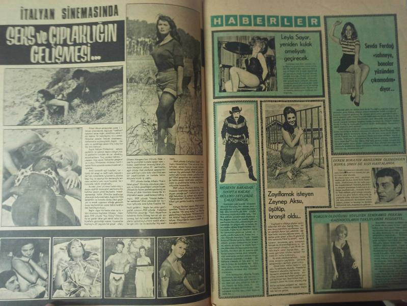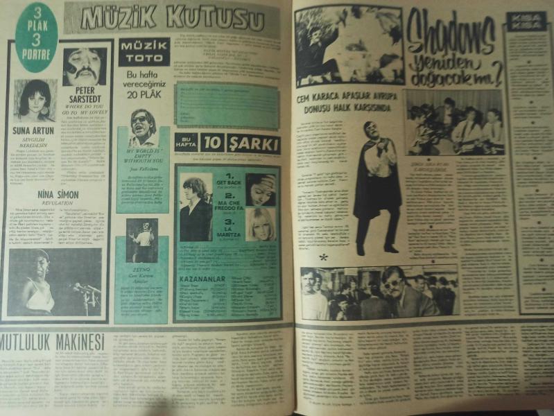 Pazar Ekstra Haftalık Aktüalite Sinema Tiyatro Müzik ve Magazin Dergisi - 29 Mayıs 1968 - Sayı:30 - Bulmaca - Bu hafta doğanlar - Çin falı - Ne var ne yok - Kaderin cilvesi - Dünyanın 1 numaralı diktatörü MAO - Silah yerine bekaret kemeri - İtalyan sinemasında seks ve çıplaklığın gelişmesi - Leyla Sayar, yeniden kulak ameliyatı geçirecek - Sevda Ferdağ ''sahneye, bonolar yüzünden çıkamadım'' diyor - Ekrem Bora - Zeynep Aksu - Hüseyin Baradan - Semiramis Pekkan - Sophia Loren - Carlo Ponti - Mutluluk Makinesi - Peter Sarstedt - Suna Artun - Nina Simon - Mutluluk Makinesi - Shadows yeniden doğacak mı? - Cem Karaca Apaşlar Avrupa Dönüşü halk karşısında - İsveç'te garip bir gelenek: Bekarlığa veda partisi - Acaba ne düşünüyor? - İtalya'da azgın boğa iki kişinin canına kıyınca boğa yarışları yasaklandı - Ennio Mancini - Antonio Licursi - Siyah Araba - Hitchcock takdim eder - Pazar Ekstra Şaka - 3 çukur - 3 yazısız fotoğraf ve haberi - Tam Takım Dergi adlı eser, Kitap > Süreli Yayınlar > Dergiler > Magazin, Moda kategorisinde İkinci El olarak satıştadır.