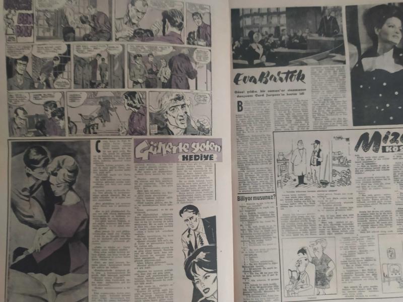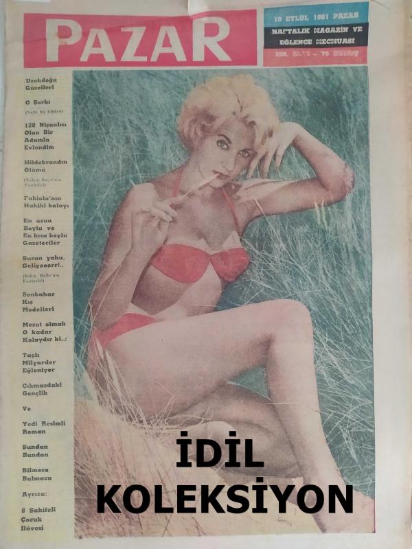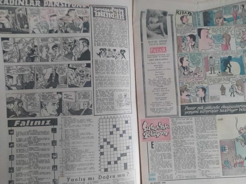 Pazar Haftalık Aktüalite Sinema Tiyatro Müzik ve Magazin Dergisi - 10 Eylül 1961- Sayı:259 - Kadınlar Pansiyonu çizgi romanı - Şundan bundan - Kibar Hırsız çizgi romanı - Susun Yahu Geliyoor - Taçlı Milyarder Evleniyor - Çıkmazdaki gençlik - Hilderondlın Ölümü - Mesut Olmak - Sahne aşkı çizgi romanı - Ne var ne yok - Müzik Kulübü - Fecri Ebcioğlu - Sonbahar Kış Modelleri - Zeynep Berk - Uaz doğu güzelleri - O şarkı - Lady Catterley'in aşığı - Fabiola'nın hakiki balayı - Çin oyunu - Biliyor musunuz? - Şeytanın Elçisi - Maurice Limat - Yenilmez yumruk ben bolt çizgi romanı - Güllerle gelen hediye - Eva Bartok - Mizah Köşesi - Genç Kız Kalbi ve Uçan Adam çizgi romanı - Beyaz perdede ne var ne yok - Hildebrandt'ın Mektubu - Susun yahu geliyor - Suzan Avcı - Tiyatro haberleri - Gazanfer Özcan - Leyla Sayar - Perde sahne fotoğraf ve haberi - Tam Takım Dergi Yıpranma, sararmalar, kupon kesiği ve yırtılmalar zamana bağlı olarak görülebilir