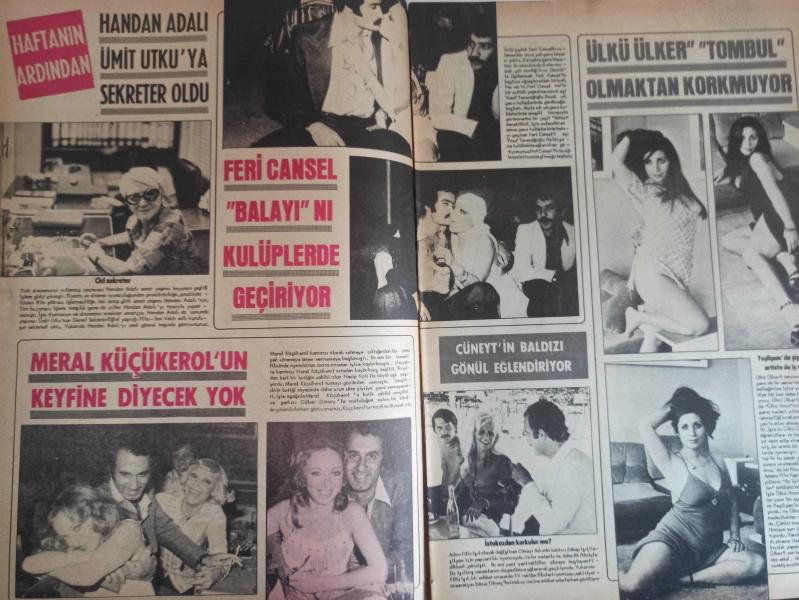 Pazar Haftalık Aktüalite Sinema Tiyatro Müzik ve Magazin Dergisi - 1976 Yılı - Sayı:1040 - Seher Şeniz - Yonca Yücel - Handan Adalı, Ümit Utku'ya sekreter oldu - Feri Cansel ''Balayı''nı kulüplerde geçiriyor - Meral Küçükerol'un keyfine diyecek yok - Yusuf Tereyağoğlu - Filiz Işıl - Cüneyt Arkın'ın baldızı gönül eğlendiriyor - Sümer Tilmaç - Ülkü Ülker ''Tombul'' olmaktan korkmuyor - Türkan Şoray filmlerinde Kadir İnanır'ı eş seçiyor - Osman Faruk Seden - Gönül Hancı bir türlü atak yapamıyor - Hülya Korur'un Aktör Morandi ile bir aşk ilişkisi ortaya çıktı - Hülya Korur avrupa basınına konu oldu - Parası ve ünü olan Serpil Örümcer ''Bunların hepsi boş şeylermiş, artık mutlu bir yaşamın özlemin içindeyim'' dedi - Ayrılma sırası Nebahat Çehre'de - Yavuz Demir - Ağlayan Kadın Müjde Ar - Hülya Koçyiğit - filiz Akın - Arzu Okay - Ceyda Karahan - Deniz Erkanat - Neri Neril - Gülgün Erdem ticaretle sinema arasında kaldı fotoğraf ve haberi - Tam Takım Dergi Yıpranma, sararmalar, kupon kesiği ve yırtılmalar zamana bağlı olarak görülebilir