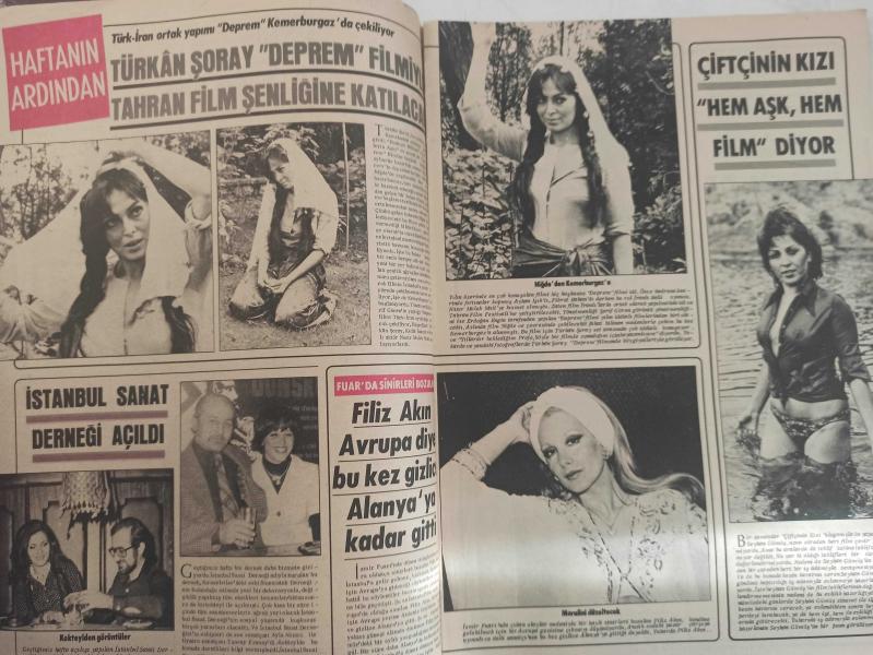 Pazar Haftalık Aktüalite Sinema Tiyatro Müzik ve Magazin Dergisi - 1976 Yılı - Sayı:1047 - Piraye Uzun - Prenses Banu - Türkan Şoray ''Deprem'' filmiyle Tahran Film Şenliğine katılacak - Ayla Akıncı - Tuncay Erana - Filiz Akın Avrupa diye bu kez gizlice Alanya'ya kadar gitti - Seyhan Gümüş çiftçinin kızı ''hem aşk, hem film'' diyor - Romalı Perihan, kendini Avrupalı artistlerden de büyük görmeye başladı: ''Raquel Welch de kimmiş!'' - Ayla Algan çocuğunu büyütüyor - ''Annelik rol yapmaktan daha zor'' - Deniz Erkanat: ''İzmir'de bana oyun oynadılar'' diyor - Fatma Girik ağır basınca ''kadın hamlet'' filmi ''intikam meleği'' oldu - Perihan Ateş'in Almanya'daki gizli nişanlısı ortaya çıktı - Seher Şeniz dansözlerin tümüne meydan okudu - Nesrin Topkapı - Alev Altın İzmir'de şarkı söylemek isterken kendini pavyonda buldu - Alev Sezer - Şeyda Senem - Ceyda Karahan - Tülin Yaprak - Müjde Ar da şarkıcılığa ''evet'' dedi - Kocasından ayrılan Gülay Alp, ortaya çıktı - Gülay Alp - Tam Takım Dergi Yıpranma, sararmalar, kupon kesiği ve yırtılmalar zamana bağlı olarak görülebilir