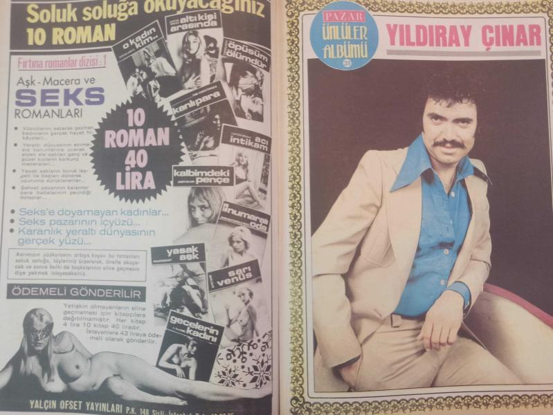 Pazar Haftalık Aktüalite Sinema Tiyatro Müzik ve Magazin Dergisi - 1976 Yılı - Sayı:968 - Melek Görgün - Perihan Ateş - Brigitte Bardot anadan doğma meydan okudu - Sandra Lee - Rita Santiago - Türkiye'de Prenses Emel - Savaş Demiray - Orhan Pekin - Faruk Sırmalı - Edip Bayoğlu - Ahmet Özhan - Orhan Gencebay - Beyza Başar - Neşe Karaböcek - Volkan Ozan - Hülya Sözer assolist oluyor - Salih Güney bu filmi bitirip askere gitti...- Hülya Koçyiğit - Türkan Şoray - Fatma Girik - Ünlüler Albümü: Yıldıray Çınar - Tunç Başaran - Arzu Okay - Meral Orhonsay - Natuk Baytan - Esen Püsküllü - Sezer Güvenirgil - Mehmet Arslan - Aliye Rona - Fatma Belgen - Nilgün Atılgan: ''Fahrettin Arslan'ın evleneceği kadın benim'' dedi - Ve Seher Şeniz ameliyat öncesi böyleydi - James Bond, şerefine verilen partide iyice dağıtmıştı - Sean Connery - Neriman Köksal - Leyla Sayar - Filiz Akın - Çolpan İlhan - Hürrem Erman - Muzaffer Tema -Nüzhet birsel - Meral Zeren -Müşerref Tezcan -Serpil Örümcer - Tam Takım Dergi Yıpranma, sararmalar, kupon kesiği ve yırtılmalar zamana bağlı olarak görülebilir