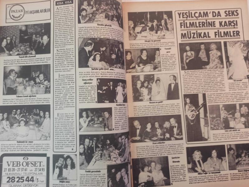 Pazar Haftalık Aktüalite Sinema Tiyatro Müzik ve Magazin Dergisi - 1976 Yılı - Sayı:975 - Leyla Sayar - Melek Görgün - Annesi diretince Feri Cansel sevgilisiyle erkenden yazlığa taşındı - Günseli Başar - Necmettin Öztemiz - Levent Nursen - Mine Kırıkoğlu - Asuman Çiftçi - Nilgün Çakıroğlu - Asil Delibaş - Nurhan Şengönül - Melek Görgün - Oya Temel - Cezmi Biren - Ali Sema Ramazanoğlu - Ayten Bahar - Hülya Tuğlu - Rasim Kıroğlu - Gülşen Bubikoğlu - Nilgün Atılgan - Tarık Akan - Ajda Pekkan - Gökmen'e Bahar Erdeniz el koydu - Ünlüler albümü: Müşerref Tezcan - Tamer Yiğit - Yılmaz Duru - Süreyya Duru - Cüneyt Arkın - Atakan Çelik - Ahmet Mekin - Remzi Jontürk - Yılmaz Güney - Osman Faruk Seden - Gönül Tansel - Güzellik Kraliçemiz Beyza Başar Filipinlerde hem yarıştı hem de fotoğraf çekti - Ajda Pekkan - Fecri Ebcioğlu - Okan Dinçer - Gönül Yazar- Cömert Baykent- Sevda Ferdağ- Zeki Müren - Canan Candan - Asuman Arsan - Atilla Ergün - Müşerref Tezcan - Necla Nazır - Tam Takım Dergi Yıpranma, sararmalar, kupon kesiği ve yırtılmalar zamana bağlı olarak görülebilir