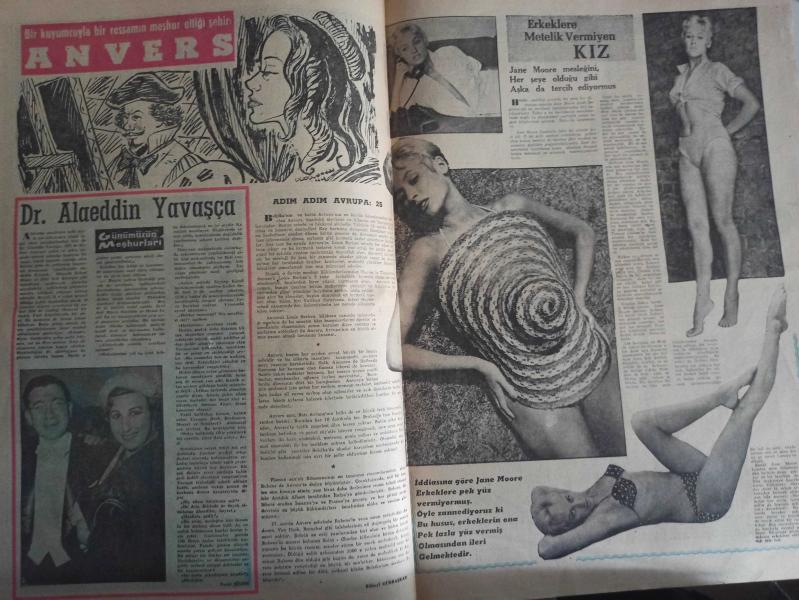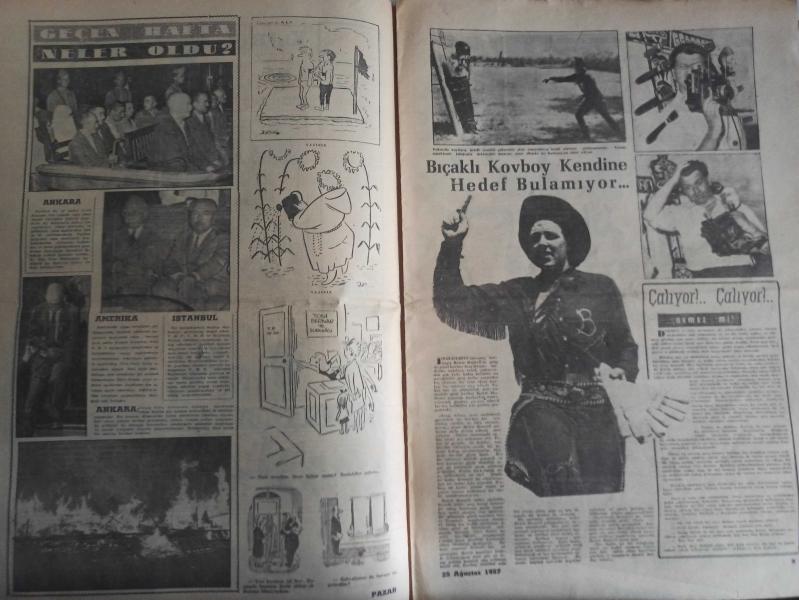 Pazar Haftalık Aktüalite Sinema Tiyatro Müzik ve Magazin Dergisi - 25 Ağustos 1957 - Sayı:48 - Erkeklere Metelik Vermeyen Kız - Gürültü Etmek Yasaktır ama Gürültüye Gitmek Yasak değildir - Kibar Hırsız ve Taş Devri Çizgi Romanları - Geçen Hafta Neler Oldu - Bıçaklı Kovboy kendine hedef bulamıyor - Çalıyor! Çalıyor! - Amansız Takip ve Genç Kız Kalbi Çizgi Romanları - Şoför Hikayesi - Ayla Doğanay - Muzaffer Akgün - Yaşar Güvenir - Tevfik Akman iş başında - Bir kuyumcuyla bir ressamın meşhur ettiği şehir Anvers - Dr. Alaeddin Yavaşça - Erkeklere Metelik Vermiyen Kız - Jane Moore - Bulmaca - Bilmece ve Eğlence - Ayakların güzelliği ve bakımı - Kadınlarla Başbaşa - Zeynep Berk -Aşk Gece Uyanır - Roman - Enternasyonal Tenis Turnuvasının Düşündürdükleri - Vakvaka Kardeş ve Uçan Adam Çizgi Romanı - Fotoğrafla Sinema Haberleri - Cannes şehri için yeni bir kraliçe - Sinema ve aktüalite - Louella O'Parsons'un Muhteşem Balosu - Elizabeth Scott fotoğraf ve haberi - Tam Takım Dergi Yıpranma, sararmalar, kupon kesiği ve yırtılmalar zamana bağlı olarak görülebilir