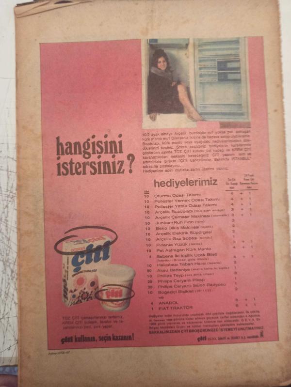 Pazar Haftalık Aktüalite Sinema Tiyatro Müzik ve Magazin Dergisi - 27 Haziran 1969 - Sayı:666 - Türkan Şoray - Bu sefer renklisi çekiliyor - Meltem Mete - Cüneyt Arkın - Behçet Nacar - Nebahat Çehre'yle sevişiyor diye Yeşilçam - Demir Karahan'a ateş püskürüyor - Sami Tunç - Uğur Güçlü - Yücel Uçanoğlu - Yılmaz Güney oysa Çirkin Kral Demir Karahan'ın elinden tutmuş, evinde onu misafir etmişti - Dönme Dolap Dönüyor - Semiramis Pekkan kürkçü dükkanına dönüverdi - Yeşilçam, Leyla Sayar'a dilediğini vermeyince - Kapalı Kutunun İçinde Bir Kadın - POP Deterjan Reklamı - Ümit Kader - Deniz Gürsoy - Turgut Karacaoğlu - Nejat Özbek - Tanju Okay - Dinç Türk - Oktay Boğazkesenli - Ünal Şahinoğlu - Dikkat! Yeşilçam'da uyuz salgını var - Ajda Pekkan - Erkan Özerman - Muammer Yeşil - Şerif Yüzbaşıoğlu - Erkan Özerman - Muammer Yeşil - Çiti Deterjan Reklamı fotoğraf ve haberi - Tam Takım Dergi adlı eser, Kitap > Süreli Yayınlar > Dergiler > Magazin, Moda kategorisinde İkinci El olarak satıştadır.