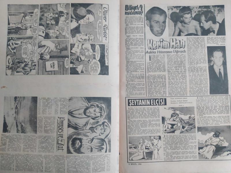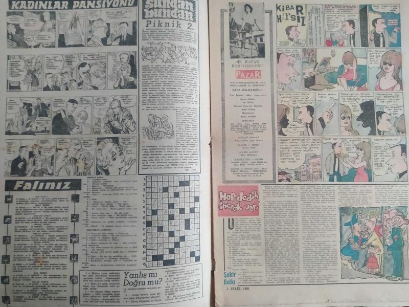 Pazar Haftalık Aktüalite Sinema Tiyatro Müzik ve Magazin Dergisi - 3 Eylül 1961 - Sayı:258 - Kadınlar Ponsiyonu çizgi romanı - Şundan bundan Piknik 2 - Falınız - Kibar Hırsız Çizgi Romanı - Hop dedik inecek var - Şakır Balkı - Üç Asker - Çıkmazdaki Gençlik - Makine arkadaşlarım - Çirkin Kadınlar da Güzeller Kadar Cazip Olabilir - Sahne Aşkı çizgi romanı - Şahane Suvare Oturaklı Vükela Meclisi - Gümüşlerimizi nasıl temizliyelim? - Zeynep Berk - Yeryüzünde Cennet - Hepsi onu taklit ediyorlar - Dünyanın en garip müzesi - Çin oyunu - Biliyor musunuz? - Kerim Han aşkta hüsrana uğradı - Şeytanın Elçisi - Yenilmez Yumruk Çizgi Romanı - İlk İhanet - Kalbin Köşesinden - Seyyar Evde Randevu - Banyodaki Kadın - Genç Kız Kalbi ve Uçan Adam Çizgi Romanı - Beyaz Perdede ne var ne yok - Makine arkadaşlarım - Hop dedik inecek var - Yeryüzünde Cennet - Perde ve Sahne - Perde Arkası - Muazzez Tahsin ve Berkant fotoğraf ve haberi - Tam Takım Dergi Yıpranma, sararmalar, kupon kesiği ve yırtılmalar zamana bağlı olarak görülebilir