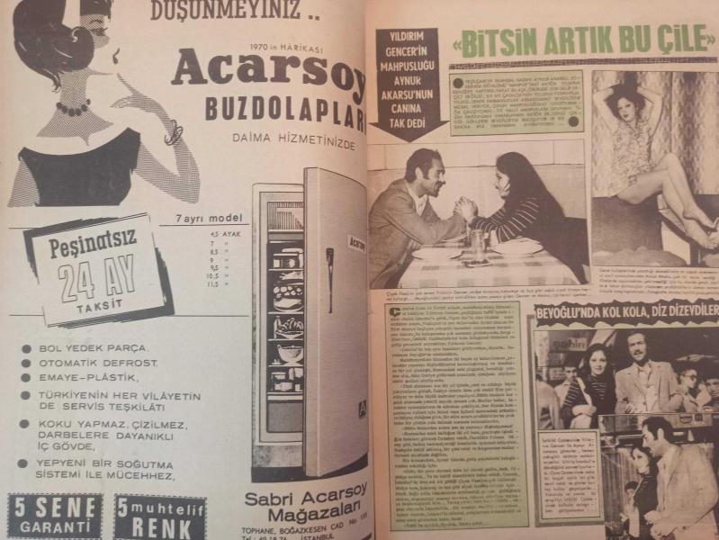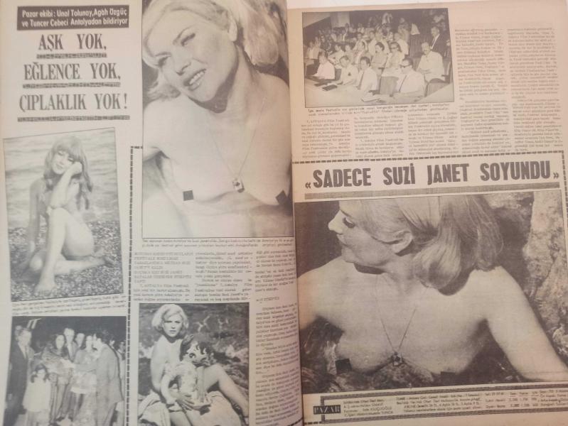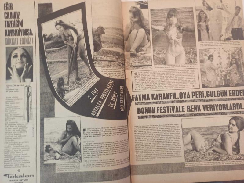 Pazar Haftalık Aktüalite Sinema Tiyatro Müzik ve Magazin Dergisi - 5 Haziran 1970 - Sayı:715 - Fatma Karanfil - Gülsüm Kamu - Fatma Karanfil, Oya Peri, Gülgün Erdem donuk festivale renk veriyorlardı - Ünal Tolunay - Agah Özgüç - Tuncer Cebeci - Suzi Janet soyundu - Acarsoy buzdolabı reklamı - Yıldırım Gencer'in mahpusluğu Aynur Akarsu'nun canına tak dedi - Tijen Par - Hülya Darcan - Karper Peynir reklamı - Filmciler Nevin Nuray'ın peşinden koşuyor - Ünsel Aybek - Sevda Ferdağ sinemayı bırakınca evlenecek - Sadri Alışık - Yusuf Sezgin - Super Job Traş Makinesi reklamı - Fikret Hakan bu sefer iyice ümitli - Cüneyt Arkın'ı nişanlısı bir dakika bile yalnız bırakmıyor - Betül Işıl - Piraye Uzun - Orhan Kapkı - Erdoğan Tokatlı - Erdoğan Tokatlı - Nihat Akın - Piraye Uzun - Orhan Kapkı - Zuhal Aktan - Sommie Bouldin - Doctor Renaud Krem Reklamı fotoğraf ve haberi - Tam Takım Dergi Yıpranma, sararmalar, kupon kesiği ve yırtılmalar zamana bağlı olarak görülebilir