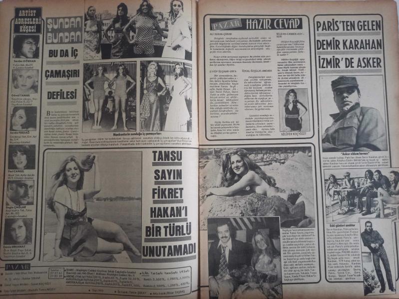 Pazar Haftalık Aktüalite Sinema Tiyatro Müzik ve Magazin Dergisi - Sayı:940 - Türkan Şoray - İlknur Taçbaş - Feri Cansel - Aynur Aydan - Bekarlık Sultanlıktır haberi - Şansal Biber - Şükrü Birand - Fevzi Sırmalı - Serdar Gökhan - Gönül Tansel - Sevda Ferdağ - Feri Cansel - Engin Çağlar - Deniz Erkanat - Tansu Sayın - Fikret Hakan - Nilüfer Koçyiğit - Demir Karahan - Sevinç Pekin - Saime Can - Barış Manço - Seyyal Taner - Seher Şeniz - Herkes En Güzel Vücut Konusunda Ayn Kanıda haberi - Deniz Erkanat - Aytekin Akkaya - Osman Seden - Gül Tener - Bahar Erdeniz - Coşkun Sapmaz - Ceyda Karahan - Sevim Çağlayan - Büyük İfşaat filmi - Yılmaz Güney - Hamit Pütün - Feri Cansel - Yılmaz Güney fotoğraf ve haberi - Dergi Tam Değildir Sadece 16 Sayfası Mevcuttur Yıpranma, sararmalar, kupon kesiği ve yırtılmalar zamana bağlı olarak görülebilir