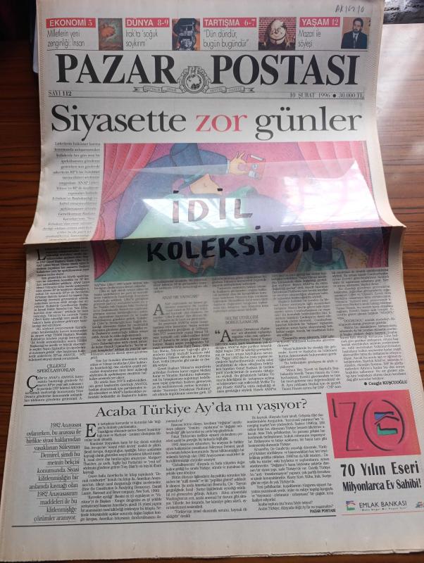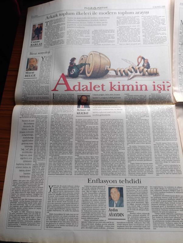 Pazar Postası Gazetesi - Turkish Newspaper - 10 Şubat 1996 - Sayı 112 - siyasette zor günler yazan Cengiz Kuşçuoğlu - Arkaik toplum ilkeleri ile modern toplum arayışı yazan Canan Barlas - biraz sosyoloji yazan Murat Belge - Adalet kimin işi yazan Mehmet Ali Kılıçbay - enflasyon tehdidi yazan Aydın Ayaydın - Refah Partisi ve iktidar sorunu yazan Taha Akyol - şiddet dalkavukluğu ya da terörizm haberciliği yazan Doğu Ergil - Avrupa'da Top 10 Albüm - İpana'dan süt dişlerine özel macun ve fırça - m- Cimri Brad Pitt - - Ali Bulaç ve BBP - Refah Partisinin iftarı - İtalya'da bizim gibi yazan Sami Kohen - İran'a kadın cumhurbaşkanı - Irak'ta soğuk soykırım yazan Dinçer Güner - Sefiller yazan Ahmet Mithat - şiirin basamaklarında bir genç adam Ayhan Bozkurt yazan Ahmet Ümit - Uluslararası 4. Boyut çevre belgeseli - CIA raporu ve halkın tüketim kalıbı - 1995 Venedik Film festivali altın Aslan ödülünü alan Cyclo vizyona giriyor - Citibank Genel Müdürü Sherazam Mazari ile söyleşi fotoğraf adlı eser, Kitap > Süreli Yayınlar > Gazeteler > Türkiye > Genel > Günlük kategorisinde İkinci El olarak satıştadır.