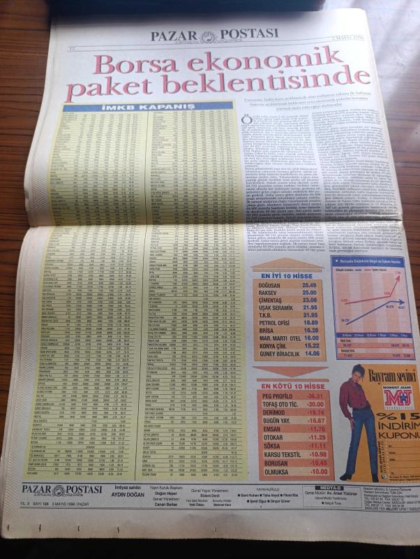 Pazar Postası Gazetesi - Turkish Newspaper - 5 Mayıs 1996 - Sayı 124 - Ortaklar kapıştı Erbakan bekliyor yazan Mete Belovacıklı - Ulus kavramı yeniden şekillenirken yazan Mehmet Ali Kılıçbay - uzlaşmalar yazan Murat Belge - değişim ve ahlak üzerine düşünceler yazan Canan Barlas - Cumhuriyet laiklik demokrasi ve çocukları yazan Ömer Servet - siyasi lider olarak Özal Taha Akyol - Kinetix İle Yere Sağlam Basın - Avrupa Müzik Top 10 - DYP'leşen ANAP'ta yeni kadrolaşma Yazan Naki Özkan - erken seçim olasılığı - sansasyon gazeteciliği yüz yaşında - 60'lık Pavarotti'nin sevgilisi 26 yaşında - AIDS için kırmızı alarm - uyuşturucu AIDS'in binek taşı - Tuğçe San'ın Avrupa çıkartması - İstanbul kanatlarımın altında filmi - bütün eserleri ile Füruzan - Zeytinoğlu motorlu taşıtlar A.Ş. Genel Müdürü Mehmet Zeytinoğlu Alfa müşterisi özeldir - Yapı Kredi bankası'nın hazırladığı Yapı Kredi Vedat Nedim Tör müzesi'nde sergilediği gramofon ve taş plak sergisi büyük ilgi gördü - İMKB kapanış, Aydın Doğan tarafından kaleme alınmıştır. Pazar Postası Gazetesi - Turkish Newspaper - 5 Mayıs 1996 - Sayı 124 - Ortaklar kapıştı Erbakan bekliyor yazan Mete Belovacıklı - Ulus kavramı yeniden şekillenirken yazan Mehmet Ali Kılıçbay - uzlaşmalar yazan Murat Belge - değişim ve ahlak üzerine düşünceler yazan Canan Barlas - Cumhuriyet laiklik demokrasi ve çocukları yazan Ömer Servet - siyasi lider olarak Özal Taha Akyol - Kinetix İle Yere Sağlam Basın - Avrupa Müzik Top 10 - DYP'leşen ANAP'ta yeni kadrolaşma Yazan Naki Özkan - erken seçim olasılığı - sansasyon gazeteciliği yüz yaşında - 60'lık Pavarotti'nin sevgilisi 26 yaşında - AIDS için kırmızı alarm - uyuşturucu AIDS'in binek taşı - Tuğçe San'ın Avrupa çıkartması - İstanbul kanatlarımın altında filmi - bütün eserleri ile Füruzan - Zeytinoğlu motorlu taşıtlar A.Ş. Genel Müdürü Mehmet Zeytinoğlu Alfa müşterisi özeldir - Yapı Kredi bankası'nın hazırladığı Yapı Kredi Vedat Nedim Tör müzesi'nde sergilediği gramofon ve taş plak sergisi büyük ilgi gördü - İMKB kapanış adlı eser Türkçe dilindedir.