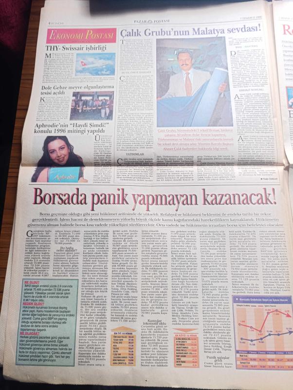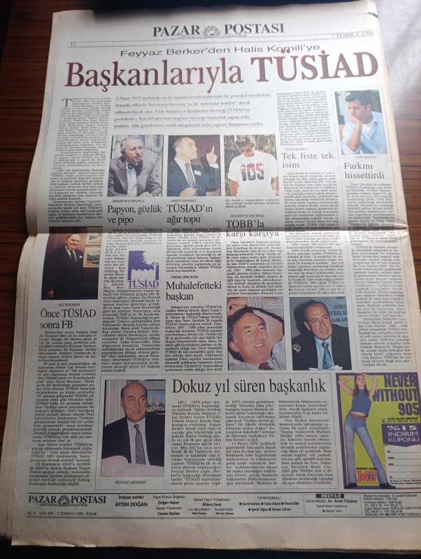 Pazar Postası Gazetesi - Turkish Newspaper - 7 Temmuz 1996 - Sayı 133 - Mesut Yılmaz zor durumda yazan Cengiz Kuşçuoğlu - Necmettin Erbakan'ın kurduğu koalisyon hükümeti - Ahmet Altan'ın arka mahallesi yazan Canan Barlas - paradokslar yazan Murat Belge - aile hukuku kavgası yazan Taha Akyol - kapalılık yozlaşma ahlaksızlaşma şiddet yazan Doğu Ergil - Renault Clio - Çalık grubunun Malatya sevdası - THY Swissair İşbirliği - borsada panik yapmayan kazanacak - RefahYol ekonomide ne yapabilir yazan Şeref Oğuz - kara para uyuşturucu ve siyaset yazan Ömer Servet - koalisyonda Refah Refah'ta koalisyonlar yazan Naki Özkan - Başkent kazanı yazan Mete Belovacıklı ve Cengiz Kuşçuoğlu - Son 20 yıldır dünyada ABD'ye yönelik saldırılar haritası - dünyada İslami hareketler ve Refah Partisi'nin farkı yazan Mustafa Özcan - en laik başbakan yazan Mehmet Ali Kılıçbay - 3. Uluslararası caz festivali başladı - Kevyn Lettau Unity fotoğraf - BMW güney sahillerinde - Feyyaz Berker'den Halis Komili'ye TÜSİAD, Aydın Doğan tarafından kaleme alınmıştır. Pazar Postası Gazetesi - Turkish Newspaper - 7 Temmuz 1996 - Sayı 133 - Mesut Yılmaz zor durumda yazan Cengiz Kuşçuoğlu - Necmettin Erbakan'ın kurduğu koalisyon hükümeti - Ahmet Altan'ın arka mahallesi yazan Canan Barlas - paradokslar yazan Murat Belge - aile hukuku kavgası yazan Taha Akyol - kapalılık yozlaşma ahlaksızlaşma şiddet yazan Doğu Ergil - Renault Clio - Çalık grubunun Malatya sevdası - THY Swissair İşbirliği - borsada panik yapmayan kazanacak - RefahYol ekonomide ne yapabilir yazan Şeref Oğuz - kara para uyuşturucu ve siyaset yazan Ömer Servet - koalisyonda Refah Refah'ta koalisyonlar yazan Naki Özkan - Başkent kazanı yazan Mete Belovacıklı ve Cengiz Kuşçuoğlu - Son 20 yıldır dünyada ABD'ye yönelik saldırılar haritası - dünyada İslami hareketler ve Refah Partisi'nin farkı yazan Mustafa Özcan - en laik başbakan yazan Mehmet Ali Kılıçbay - 3. Uluslararası caz festivali başladı - Kevyn Lettau Unity fotoğraf - BMW güney sahillerinde - Feyyaz Berker'den Halis Komili'ye TÜSİAD adlı eser Türkçe dilindedir.