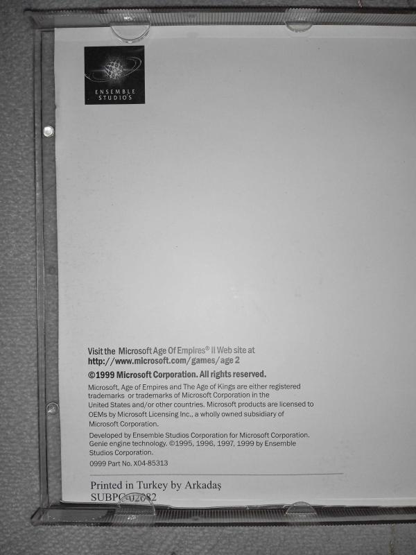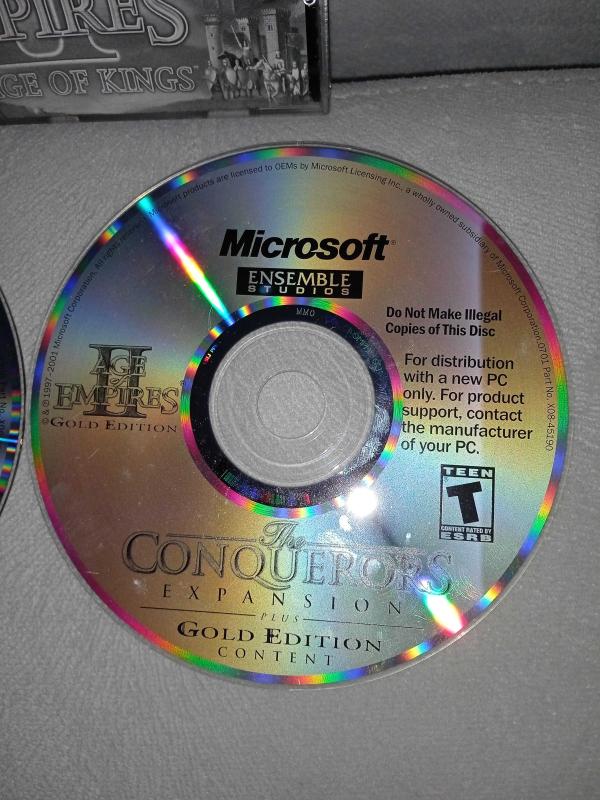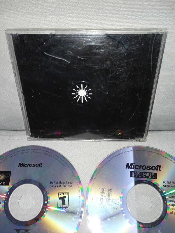 Pc oyun Age of empires 2 The age of Kings. Dönemin iyi kalite baskılı kopya oyunu. 2 disk. Diskler 10 üzerinden 8.5 Çalışıp çalışmadığı DENENMEDİ. Koleksiyonluk. başlıklı antika/koleksiyon objesinin menşei belirtilmemiştir. Objenin ait olduğu dönem bilinmeketedir.