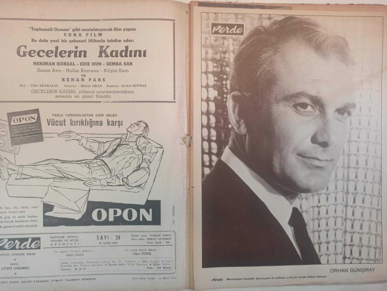 Perde Haftalık Ses Tiyatro ve Sinema Mecmuası Dergisi - 16 Mart 1964 - Sayı:24- Türkan Şoray - Orhan Günşiray - Gecelerin Kralı Filmi - Neriman Köksal - Ediz Hun - Semra Sar - Opon İlaç Reklamı - Altan Karındaş - Nebahat Çehre - Ayhan Işık - Ahmet Sezgin - Muzaffer Tema - Leyla Sayar - Türkan Şoray - Alain Delon - Romy Schneider - Gina Lollobrigida - İzzet Benice - Göksel Arsoy - Refik Yılmaz - Fecri Ebcioğlu - Ertan Anapa - Filiz Akın - Vahi Öz - Erkan Yolaç - Erdoğan Bazer - Necla Ateş - Celal İnce - Necla İz - Özcan Tekgül - Lütfi Güneri - Peri Han - Sevda Ferdağ - Nilgün Elgin - Onur Onat - Tevhit Bilge - Orhan Erçin - Hülya Koçyiğit - Işın Kaan - Brigitte Bardot - Elke Sommer - Nurinnisa Toksöz - Bülent Oral - Pervin Par - Aziz Basmacı - Tamer Yiğit - Nezih Turan - Meyhaneci Filmi - Rengin Arda - Erkan Yolaç - Hüseyin Baradan - Zühal Tan - Necdet Tosun fotoğraf ve haberi - Tam Takım Dergi Yıpranma, sararmalar, kupon kesiği ve yırtılmalar zamana bağlı olarak görülebilir