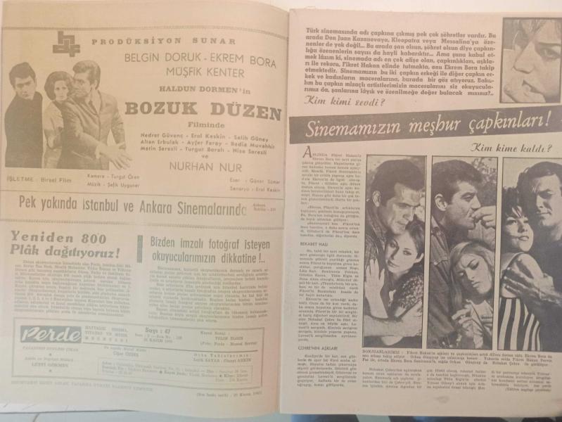 Perde Haftalık Ses Tiyatro ve Sinema Mecmuası Dergisi - 22 Kasım 1965- Sayı:47- Tülin Elgin - Bozuk Düzen Filmi - Belgin Doruk - Ekrem Bora - Müşfik Kenter - Nurhan Nur - Orhan Günşiray - Fikret Hakan - Pervin Par - Nebahat Çehre - Muzaffer Tema - Devlet Devrim - Semiramis Pekkan - Gülsüm Kamu - Yılmaz Güney- Michele Mercier - Mylene Demongeot - Sylvie Vartan - Johnny Hallyday - Nebahat Çehre - Turgut Demirağ - Gülşen Işık - Cüneyt Gökçer - Gürel Ünlüsoy - Aziz Sarıkaya - Necla Ateş - Gönül Yazar - Tülin Elgin - Fikret Hkan - Armağan Şenol - Alberto Cortez - Sadri Alışık - Filiz Akın - Leyla Sayar - Cüneyt Arkın - Elvis Presley - Behiye Aksoy - Perihan Altındağ - Selma Güneri - Nebahat Çehre - Gönül Yazar - Mualla Eken - Müzeyyen Senar - Ahmet Sezgin - Yıldız Tezcan - Nuri Sesigüzel - Nurinnisa Toksöz - Efkan Efekan - Leyla Tunca - Tony Curtis - Ajda Pekkan - Müşfik Kenter - Gripin İlaç Reklamı - Südorono Krem Reklamı - Luna Park Gazinosu - Ahmet Sezgin - Saime Sinan - Sevim Tan Ürek fotoğraf ve haberi - Tam Takım Dergi Yıpranma, sararmalar, kupon kesiği ve yırtılmalar zamana bağlı olarak görülebilir