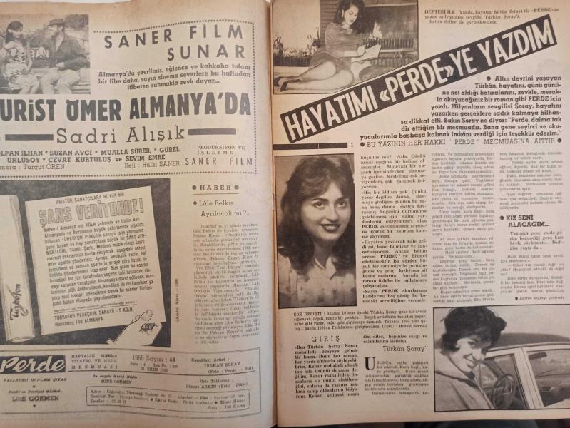 Perde Haftalık Ses Tiyatro ve Sinema Mecmuası Dergisi - 31 Ekim 1966 - Türkan Şoray - Turist Ömer Almanya'da - Sadri Alışık - Lale Belkıs - Hüseyin Baradan - Audrey Hepburn - Hele Coccinelle - Ömer Şerif - Ulvi Doğan - Efgan Efekan - Orhan Günşiray - Nilgün Arslaner - Leyla Özyazıcı - Semra Kızıltan - Zeka Ayşen - Sezer Güvenirgil - Gülistan Sezan - Aylin Öndersev - Zeki Müren - Ajda Pekkan - Nigar Uluerer - Orhan Boran - Ateş Böcekleri - Aysel Akın - Gülsün Kamu - Peri Han - Efgan Efekan - Saadettin Sırrı - Avni Anıl - Butik Ayfer - Mükerrem Sarol - Bob Hope - Jack Lemmon - Fikret Hakan - İsmet Ay - Jerry Lewis - Mine Gökmen - Gripin İlaç Reklamı - Südorono İlaç Reklamı - Pertev Krem Reklamı - Tam Takım Dergi Yıpranma, sararmalar, kupon kesiği ve yırtılmalar zamana bağlı olarak görülebilir